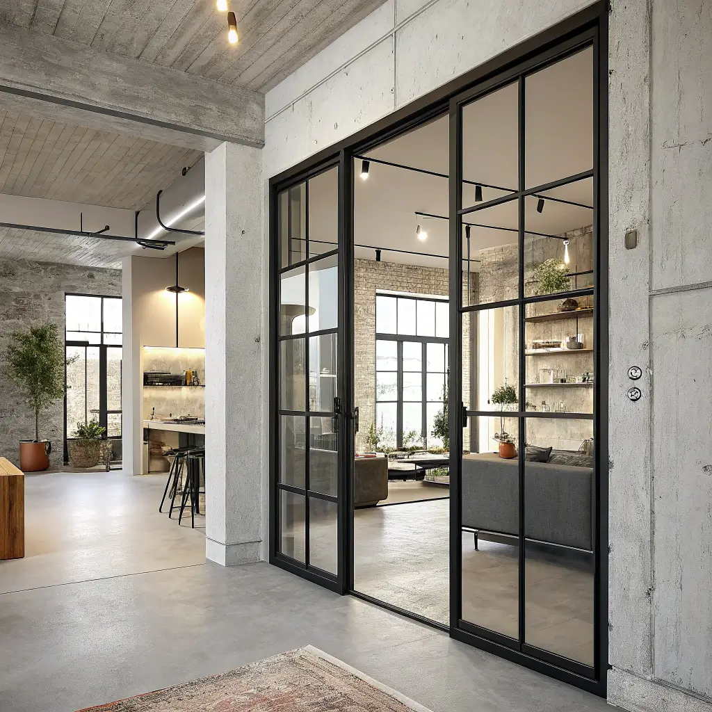 Black metal frame double doors bring industrial sophistication to residential settings. They’re bold, architectural, and make every entrance feel like you’re walking into a design magazine.