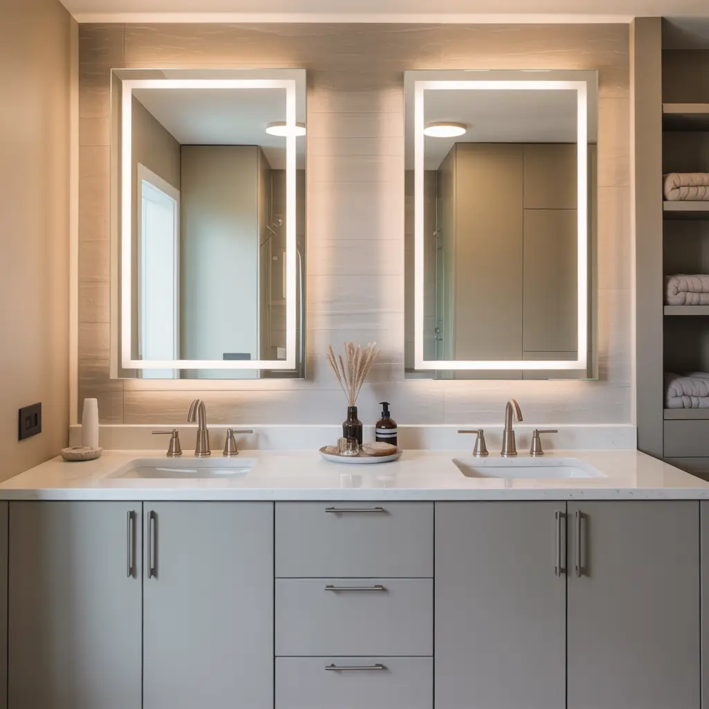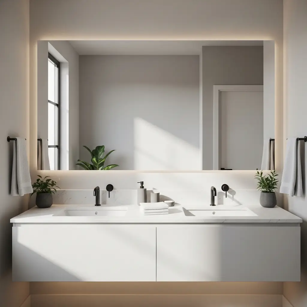 We chose a double vanity with an integrated mirror spanning the entire width, featuring built-in LED backlighting. The seamless integration makes the bathroom feel larger and more luxurious than separate components ever could. Every guest comments on that mirror setup.