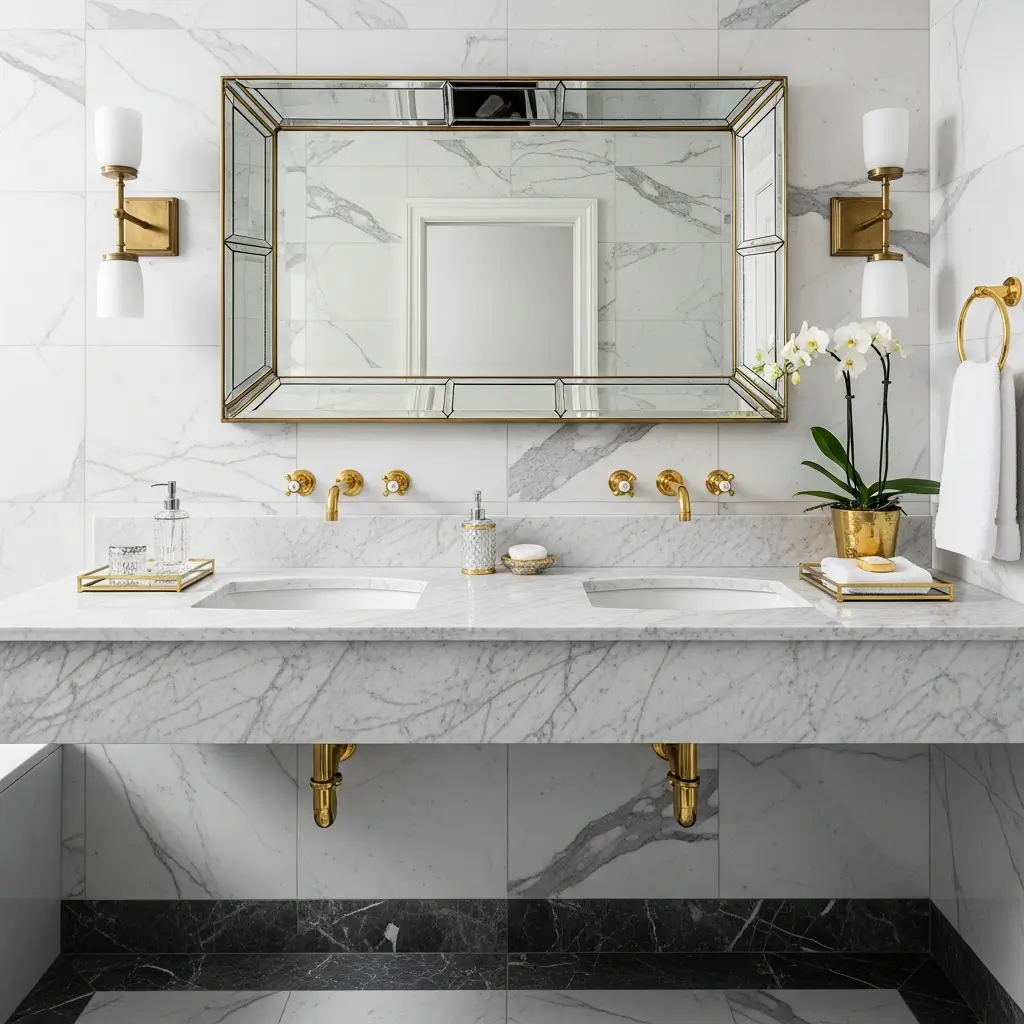 Luxury marble vanities typically feature book-matched slabs where veining creates mirror patterns across the surface. Popular choices include Carrara (classic white with gray veining), Calacatta (white with gold veining), or dramatic Nero Marquina (black with white veins). Expect 72-84 inch widths for proper double sink luxury.