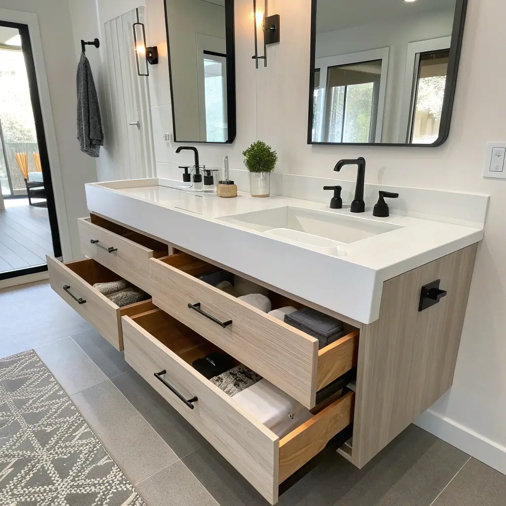 I installed a wall-mounted minimalist double vanity in our master bath, and the floating design makes the entire room feel twice as big. The seamless drawer fronts with push-to-open mechanisms mean no handles to clean around, and the integrated sinks create one continuous surface. Less grout lines equals less scrubbing – winning!