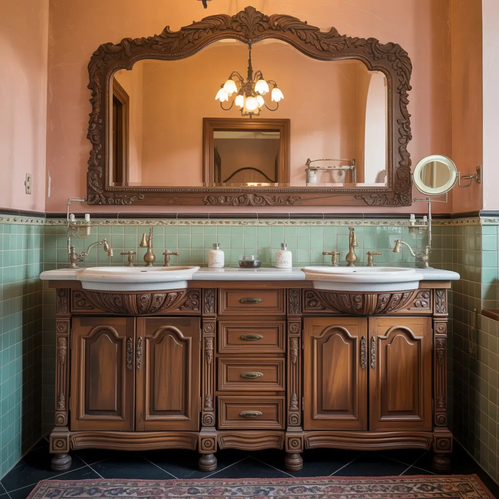 Vintage double vanities feature ornate details, turned legs, and decorative hardware. Whether you choose authentic antiques or quality reproductions, look for solid wood construction, detailed carvings, and period-appropriate fixtures. Standard widths range from 60-72 inches.