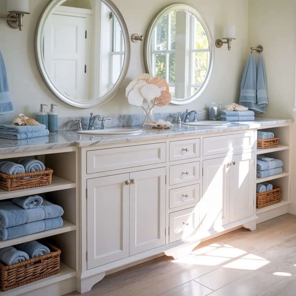 Coastal double sink vanities bring beach house vibes to your daily routine, making every morning feel like vacation. This style works whether you’re actually coastal or just coastal-inspired (landlocked beach lovers, unite!).