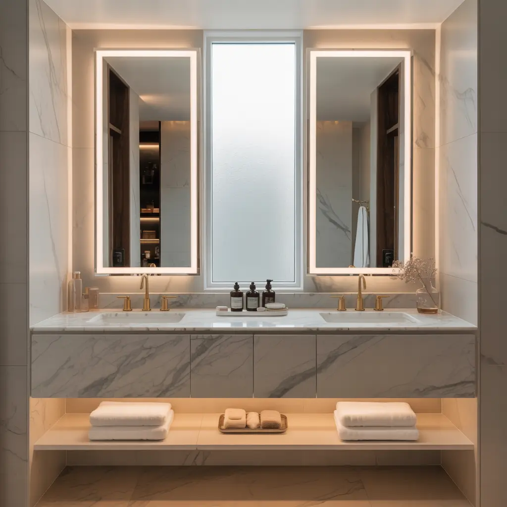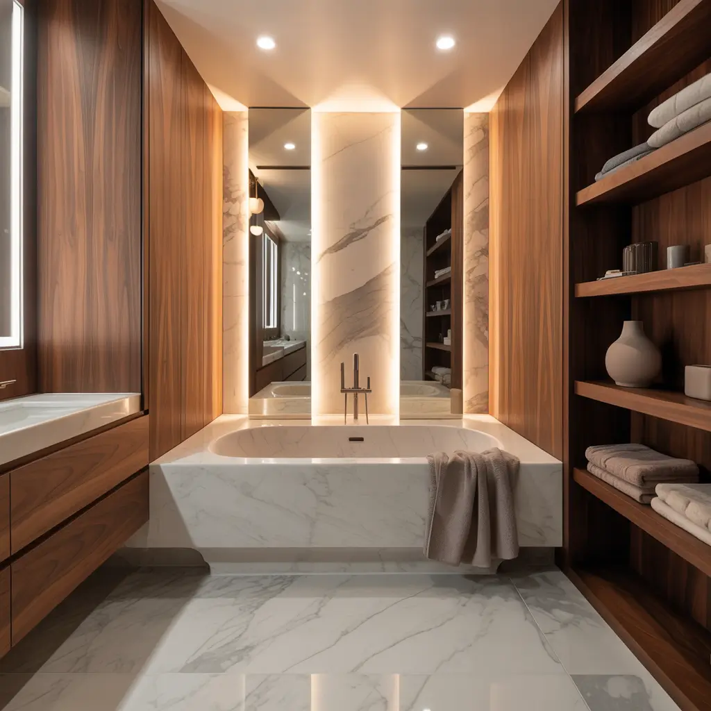 The ratio matters—60% marble to 40% wood usually works best. Too much wood feels like a sauna; too much marble feels like a mausoleum. I use marble for surfaces that get wet (shower, tub surround) and wood for vanities and shelving.