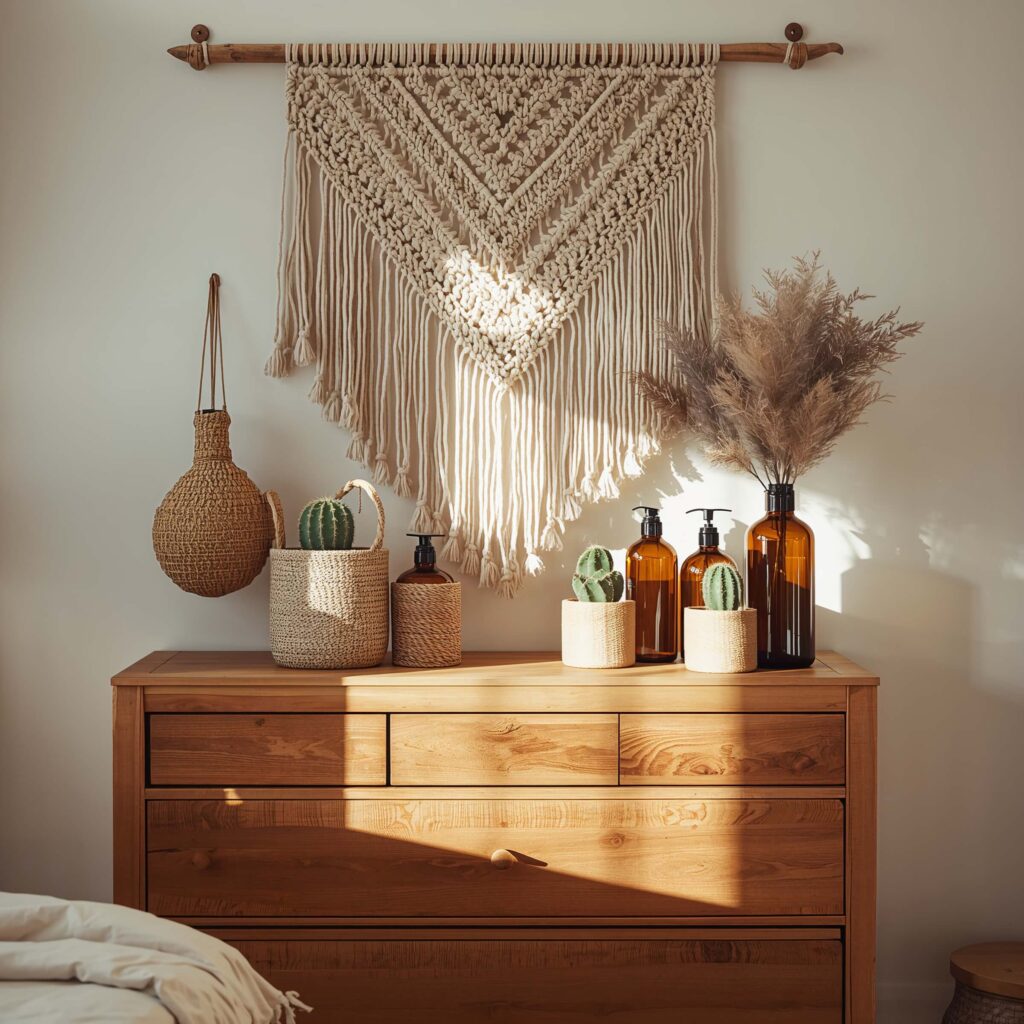 Start small with a macrame wall hanging positioned above your dresser. The texture adds instant warmth and breaks up all those hard surfaces. But here’s where it gets fun – don’t stop at wall art. I discovered these adorable macrame plant hangers that you can actually place on your dresser top. They’re like little suspended gardens!