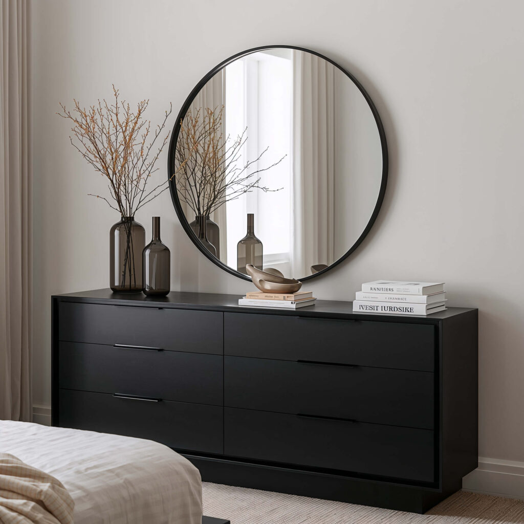 For a truly modern look, ditch the traditional rectangular mirror. I’m talking about geometric shapes, asymmetrical designs, or those trendy sunburst mirrors that everyone’s losing their minds over. Position your mirror as the focal point, then build your dresser decor around it.