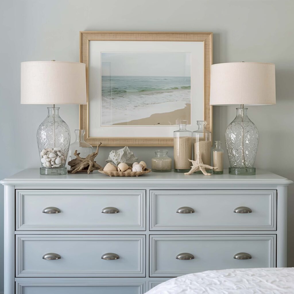 The magic happens when your wall art conversations with your dresser styling. If you’ve got brass accents on your dresser, include a gold frame up top. Picked a blue color scheme? Echo it in your artwork. It’s all about creating one cohesive moment, not separate zones.