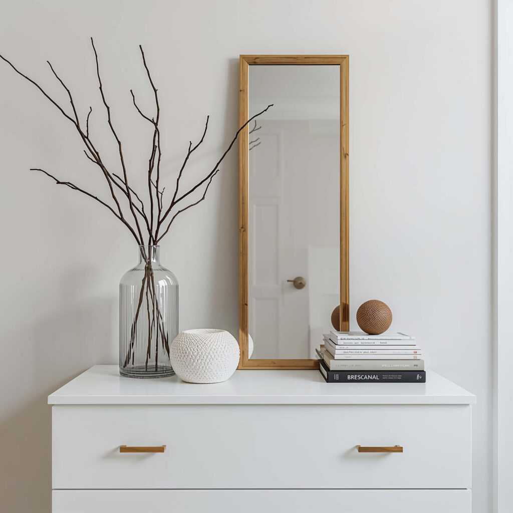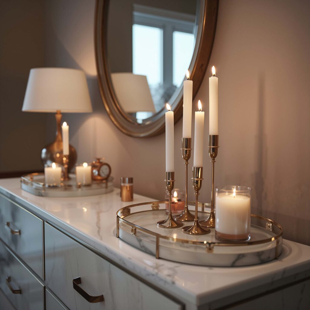 Start with a tall element as your anchor – a slender vase, a vertical mirror, or even a stack of pretty boxes. This draws the eye up and makes your space feel larger. Then layer in medium and low elements, but keep the footprint small. It’s like building a little skyline on your dresser.
