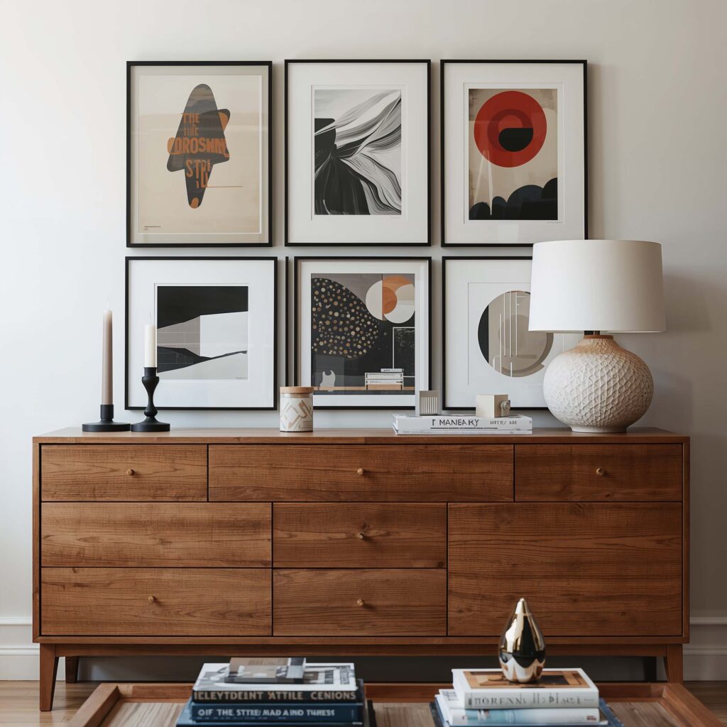 The key to layering art? Start with your largest piece and build around it. I hung a big abstract print as my anchor, then added smaller pieces around it. Mix frame styles, overlap slightly, and don’t be afraid to lean some pieces against the wall on your dresser top. It’s that collected-over-time look we’re after.
