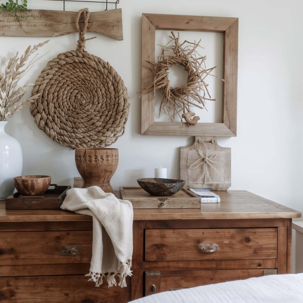 Start with one statement wooden piece – maybe a carved bowl, a smooth driftwood sculpture, or even a small wooden tray. Then build from there. I found this incredible piece of burl wood at a craft fair that looks like abstract art. It cost me $15 and gets more compliments than anything else in my room.