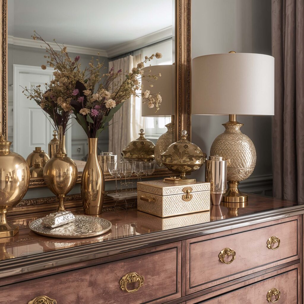 The trick with metallics is restraint. You want glamorous, not Vegas hotel room. Pick one metal and stick with it throughout your dresser styling. I’m team brass all the way, but rose gold, copper, and mixed metals can look incredible too. Just commit to your choice.
