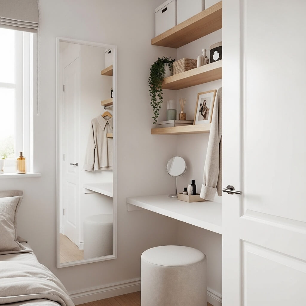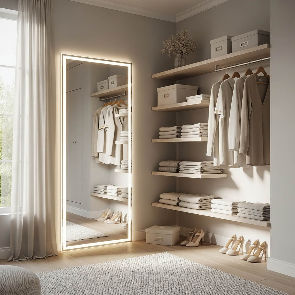 For tight quarters, I’m obsessed with multi-functional mirror solutions. Think mirrors that pull double duty—like an over-the-door full-length mirror with built-in jewelry storage on the back. You get your glam factor without sacrificing precious floor space.