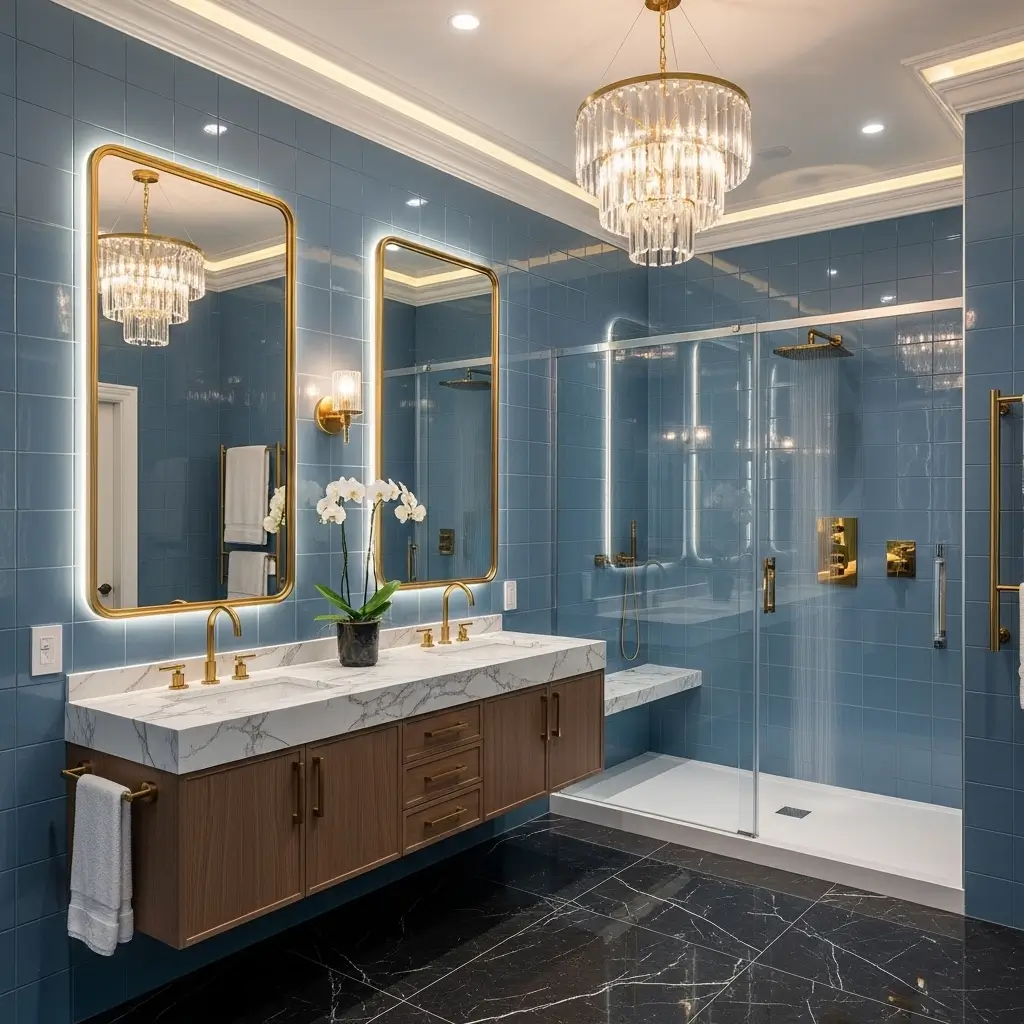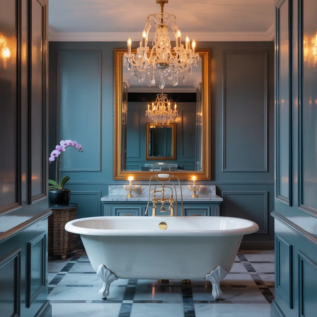 For contemporary glam, think clean lines, reflective surfaces, and strategic lighting. Dusty blue provides the perfect canvas for glamorous touches without competing for attention.