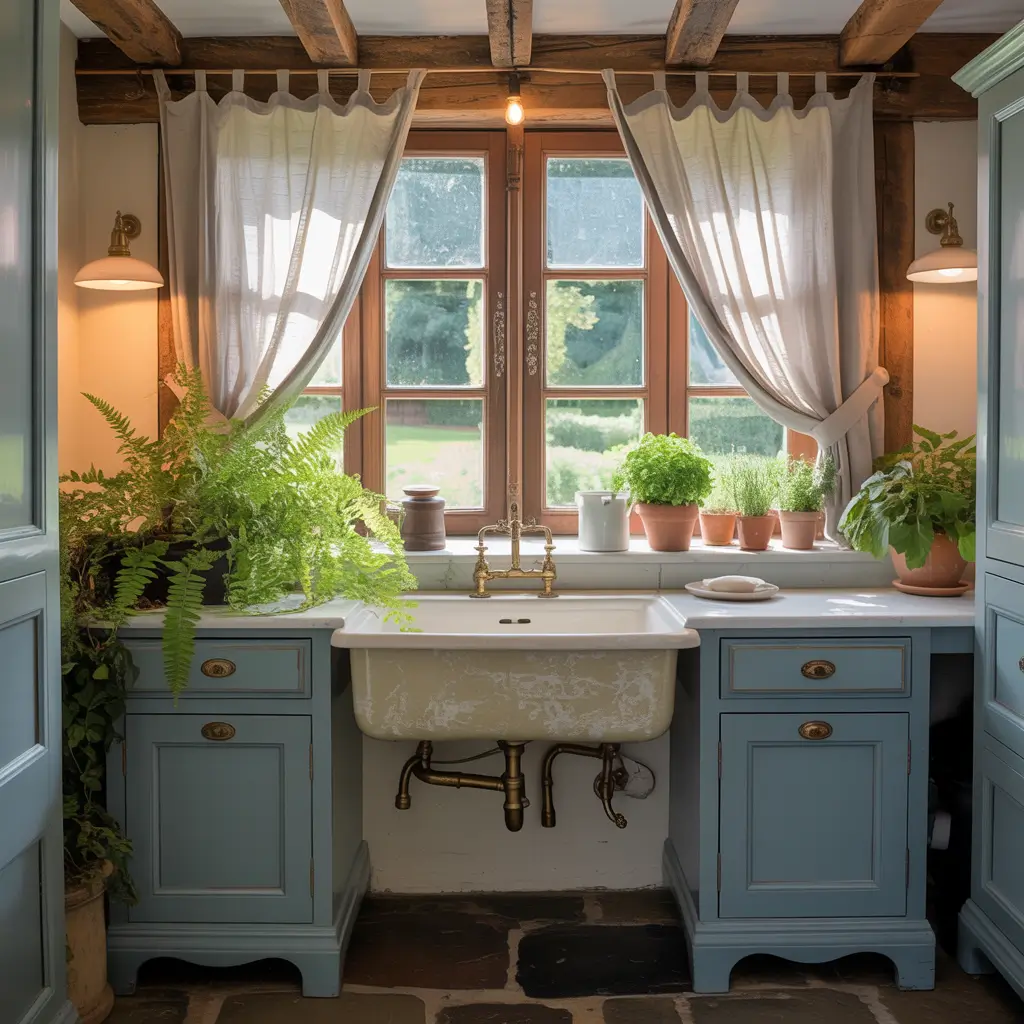 Dusty blue in a rustic cottage bathroom creates this perfect balance of refined and relaxed. The color brings sophistication to rustic elements while maintaining that cozy, lived-in feeling cottage style is known for.