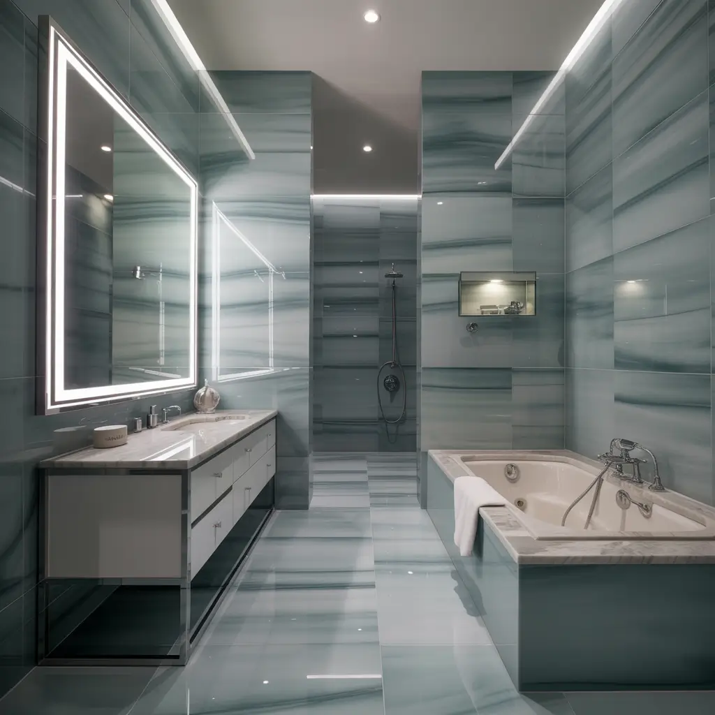 For maximum impact, choose marble with blue-gray veining that echoes your wall color. The visual connection between the natural stone and painted surfaces creates a cohesive, expensive-looking design that never goes out of style 🙂