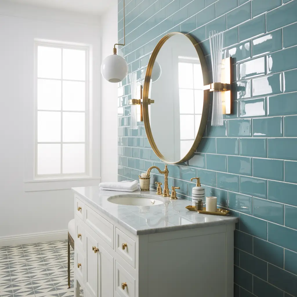 What works best is brushed or antique gold rather than shiny yellow gold. Think warm, matte finishes that complement dusty blue’s subtle nature. Add a gold-framed mirror, some gold light fixtures, and suddenly your bathroom feels like a boutique hotel.