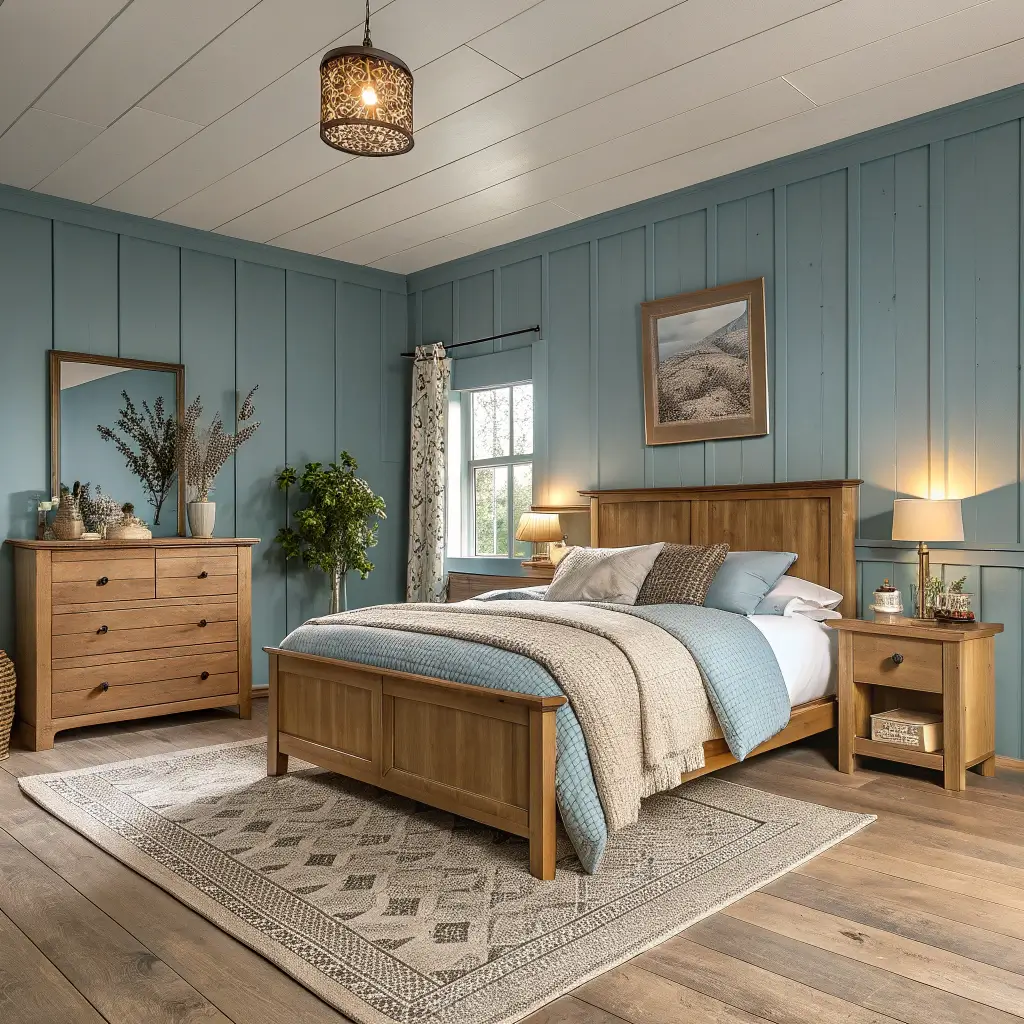 I specifically chose walnut furniture against my dusty blue walls. The contrast makes both elements pop. Light wood like oak or pine works too, but darker woods create more drama.