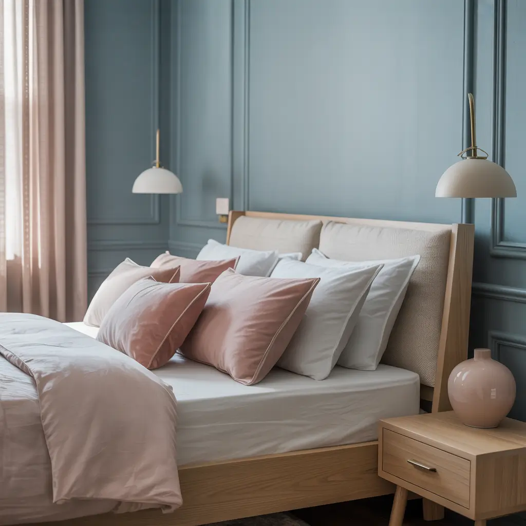• Blush bedding against dusty blue walls