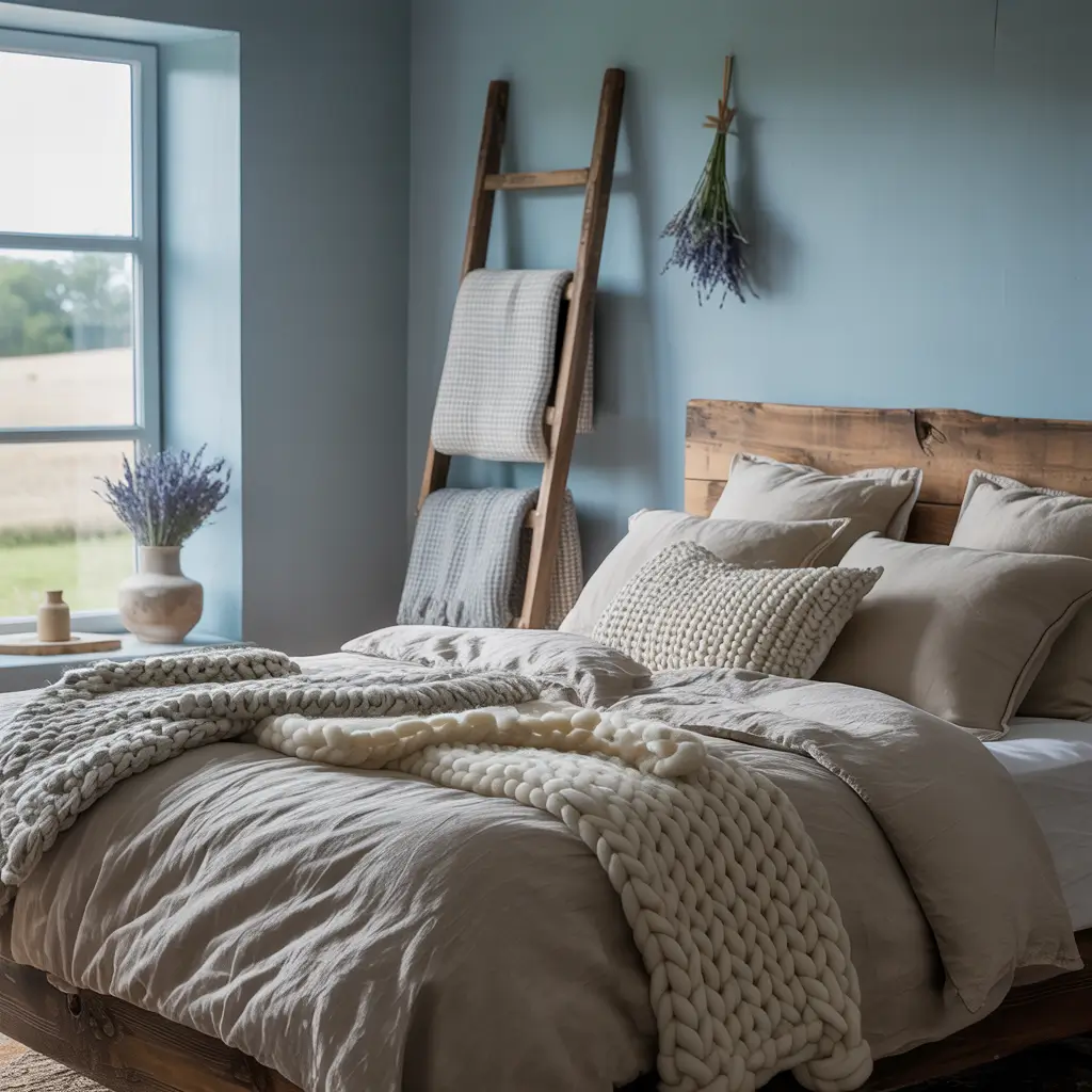 The combination of dusty blue walls with warm wood furniture creates this incredible balance between cool and warm tones. My master bedroom rocks this setup, and I literally never get tired of looking at it. The wood prevents the blue from feeling cold while the blue keeps the wood from looking too rustic.