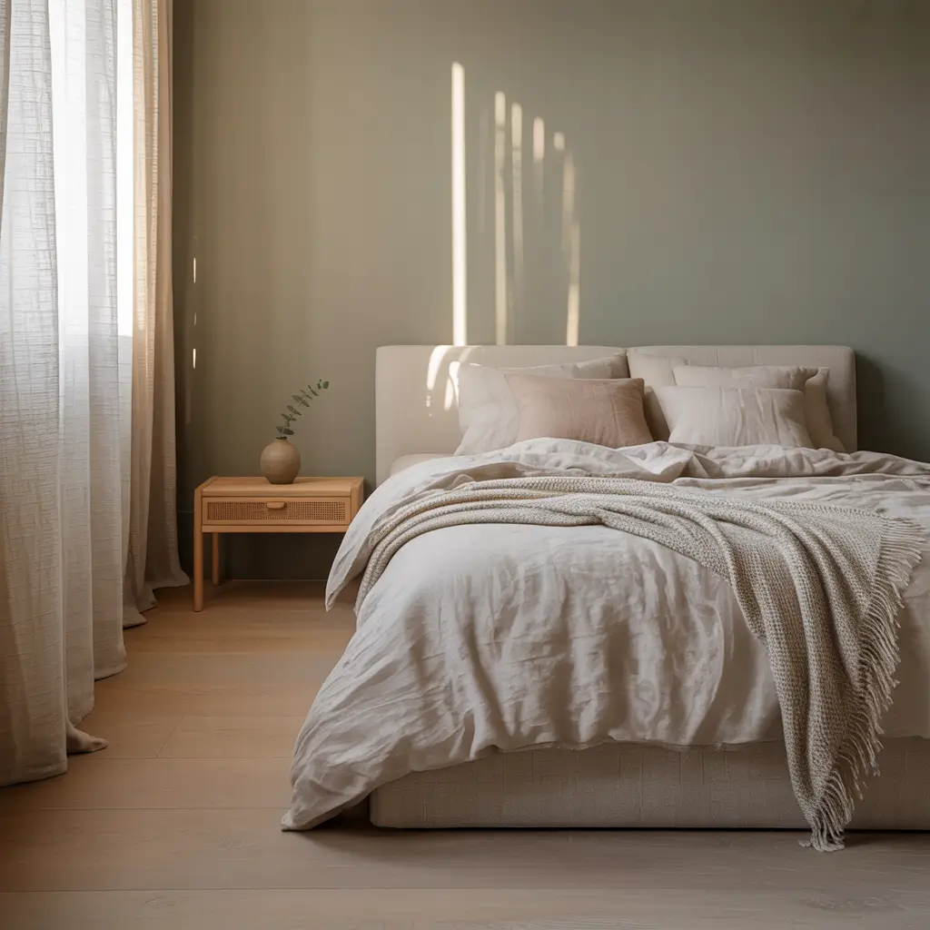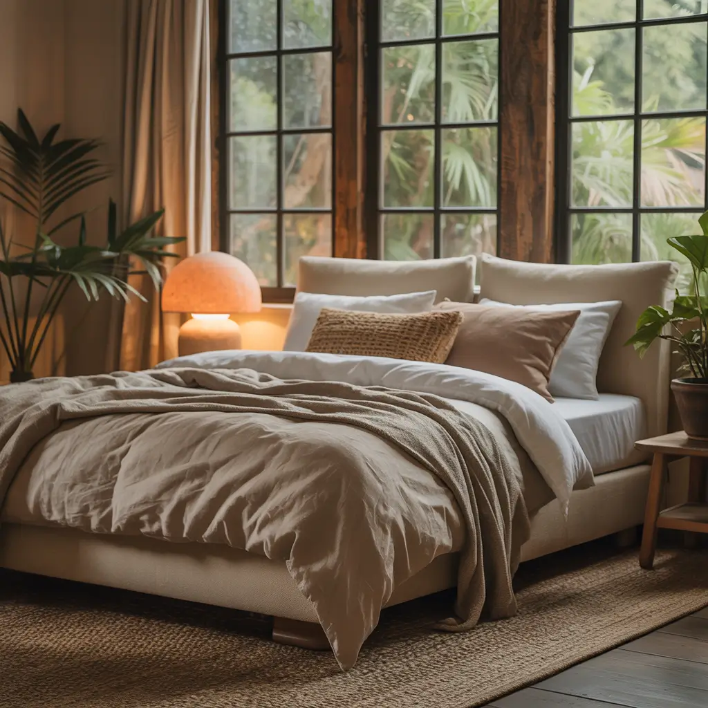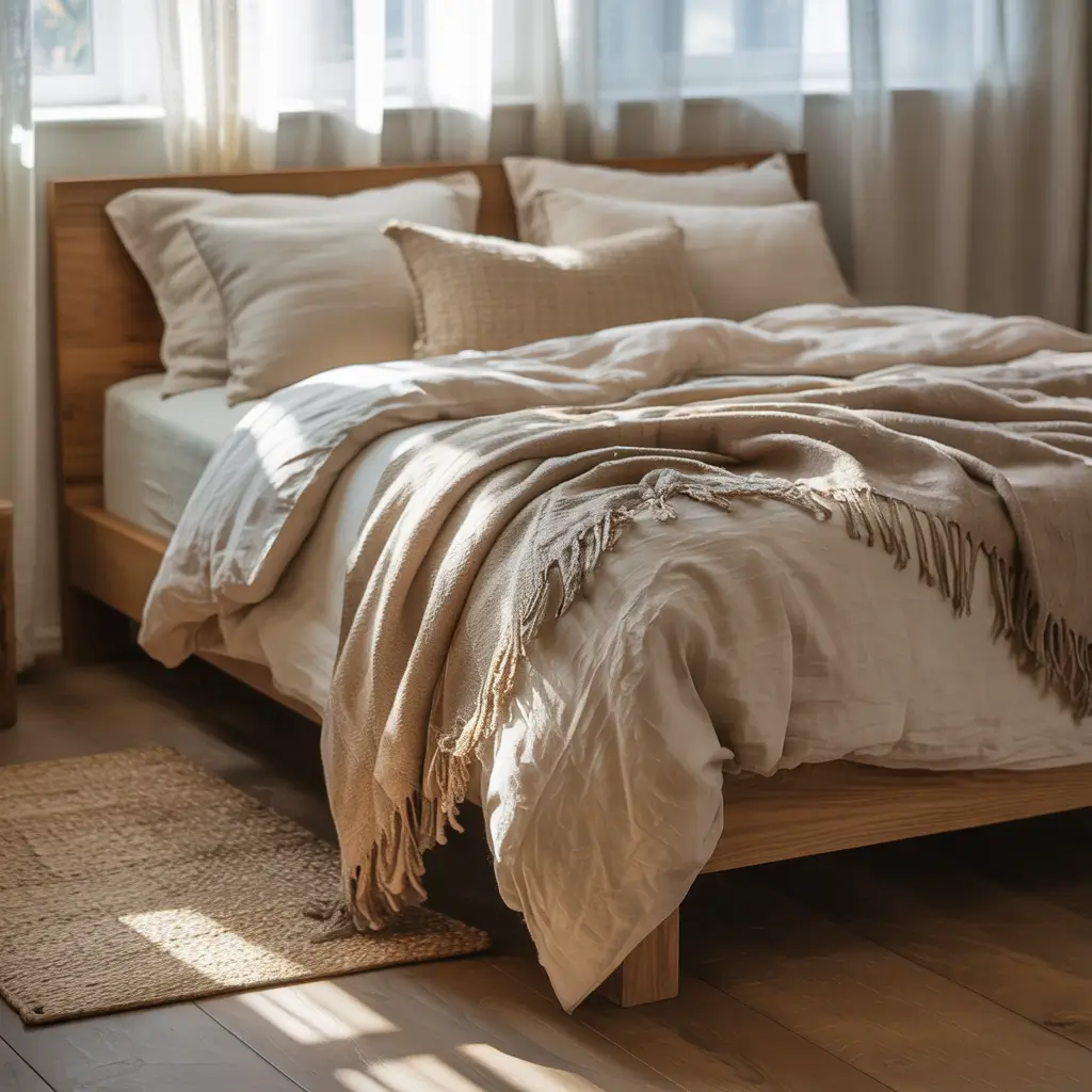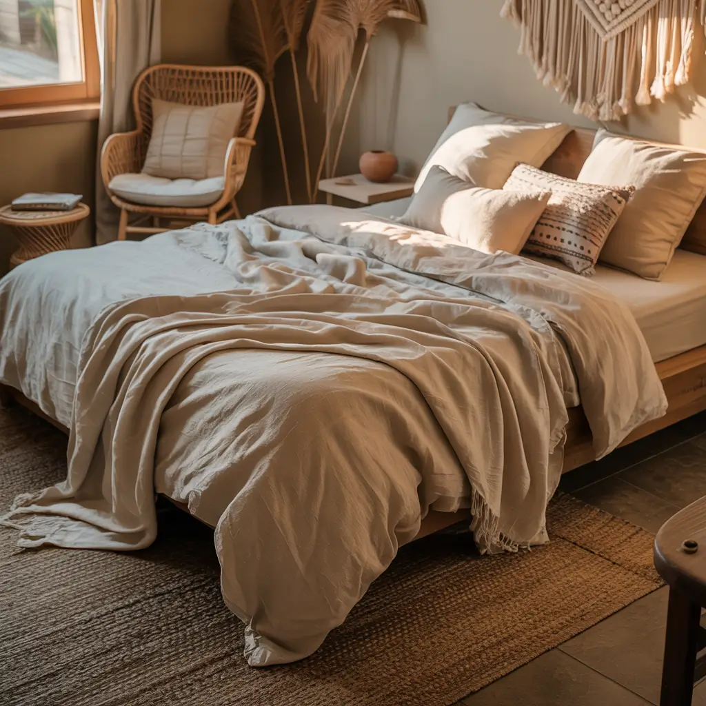 Layer different weights and weaves for visual interest. Start with crisp organic cotton sheets, add a linen duvet cover, throw on a cotton waffle weave blanket, and finish with a chunky knit at the foot of the bed. The varied textures create depth while maintaining that cohesive earthy vibe.