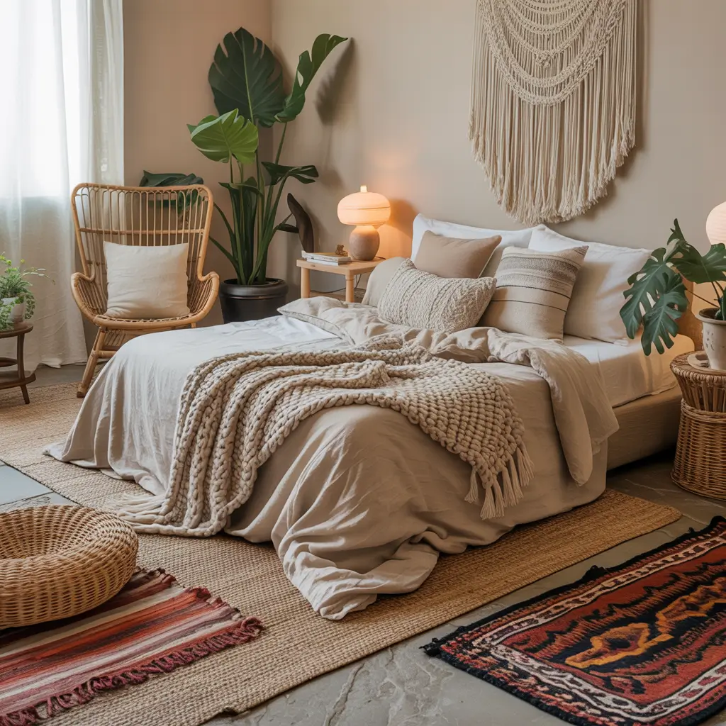 Start with a foundation of warm terracotta, ochre, and burnt sienna. These colors ground the space while letting you play with patterns. Mix geometric prints with florals, add some tribal-inspired textiles, and don’t forget the macramé wall hanging—it’s basically mandatory at this point.