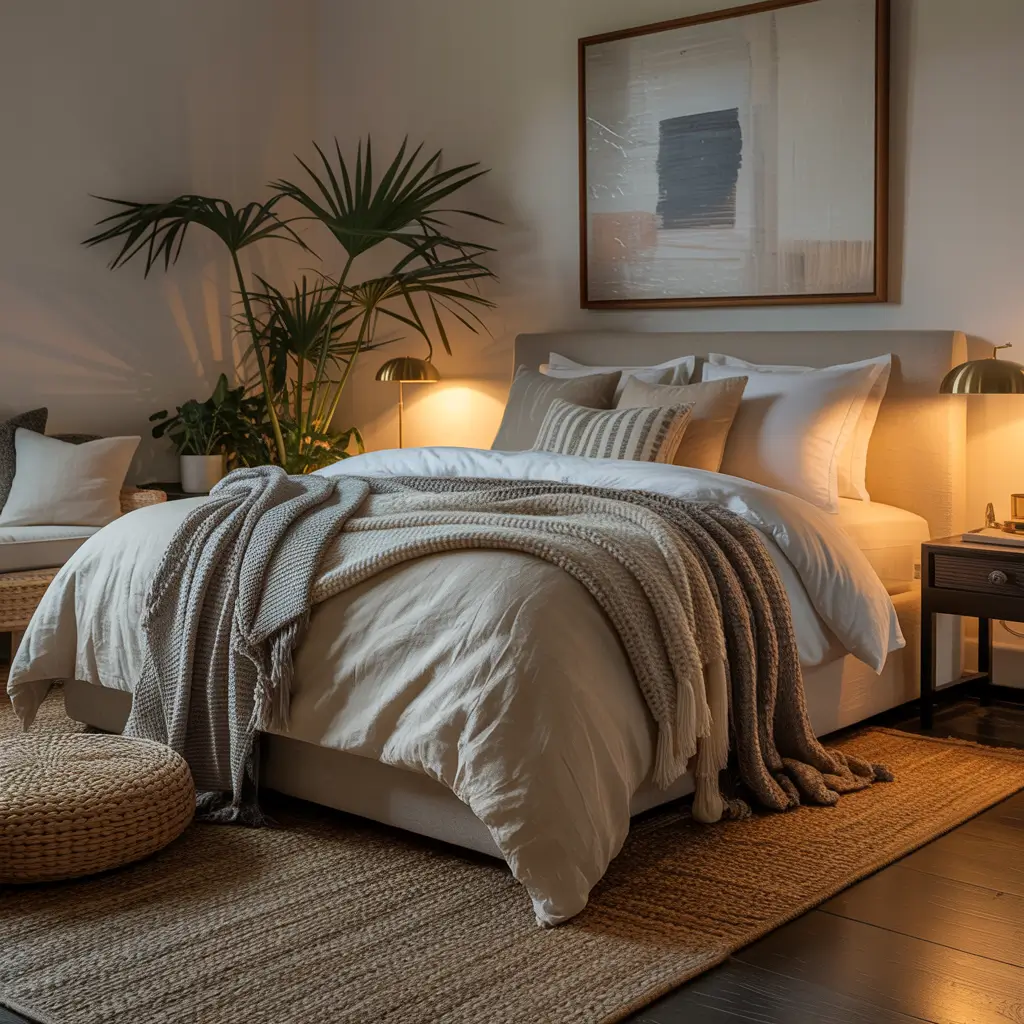 Natural textures do the heavy lifting here. Layer a chunky knit throw over linen sheets, add a jute rug underfoot, and boom—instant coziness without the clutter.