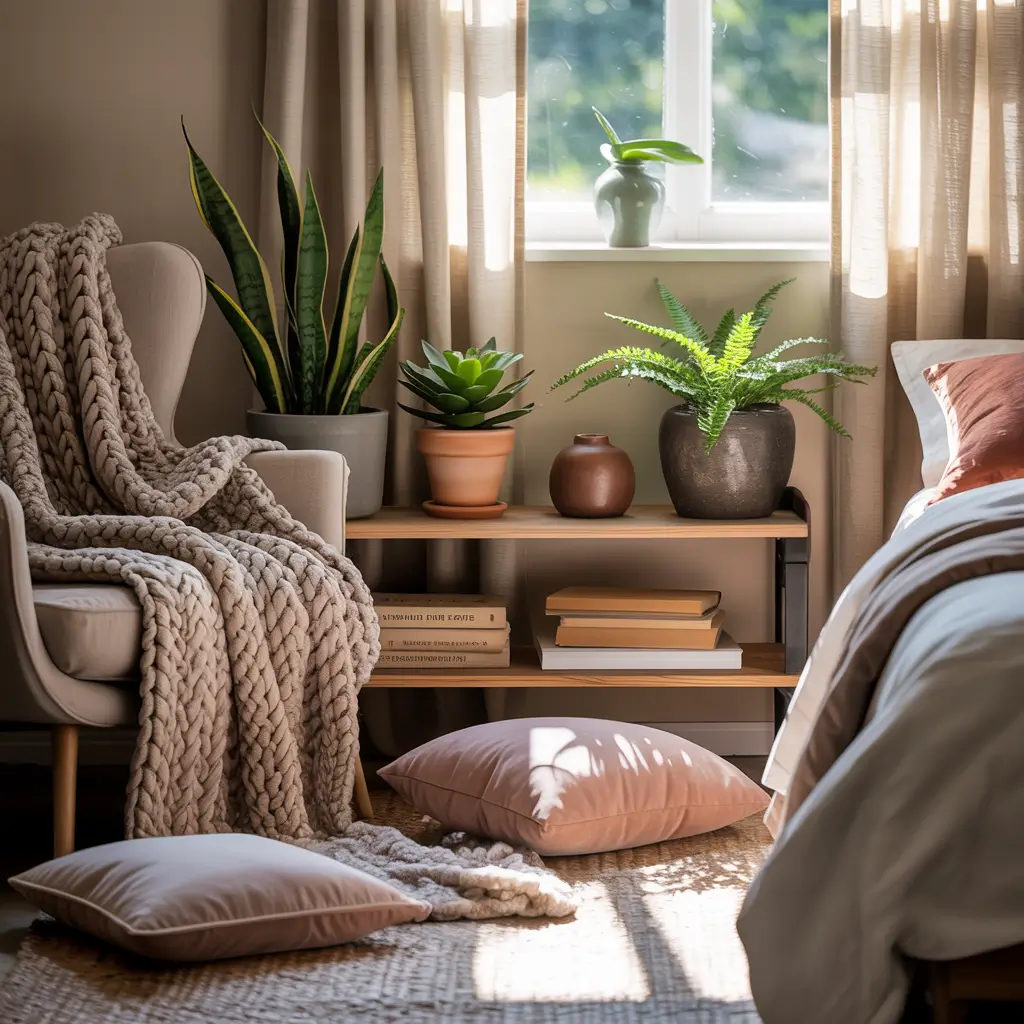 Set up a reading nook with a comfortable chair in natural materials, add a small side table in raw wood, throw in a sheepskin rug, and hang a plant or two. This corner becomes your meditation space, reading spot, or just somewhere to hide when life gets too much.