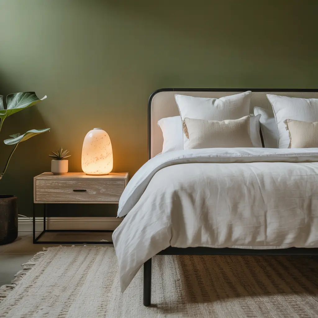 An olive green bedroom feels like a peaceful forest retreat, a perfect escape from the chaos of the day.