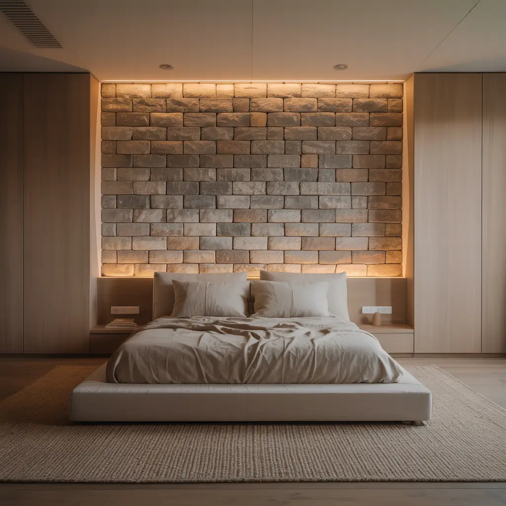 I recently saw a bedroom with a rough-hewn stone ledge running along the wall behind the bed, which served as both a headboard and a display shelf. Paired with a simple wooden bed frame and soft, neutral bedding, the effect was breathtaking. It’s a minimalist approach, but the natural textures make it feel anything but cold.