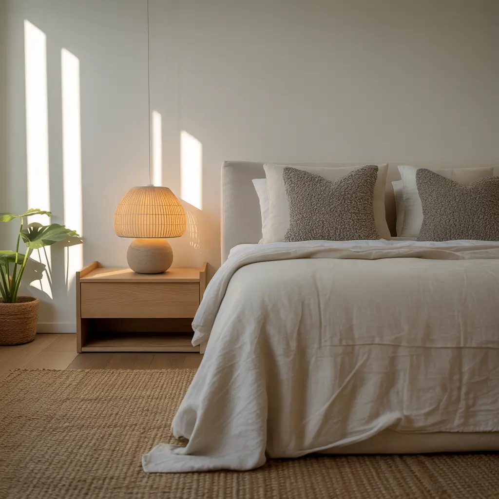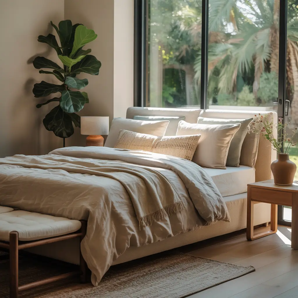 • Bedding: Layers of linen and cotton in shades of taupe, cream, and sand.