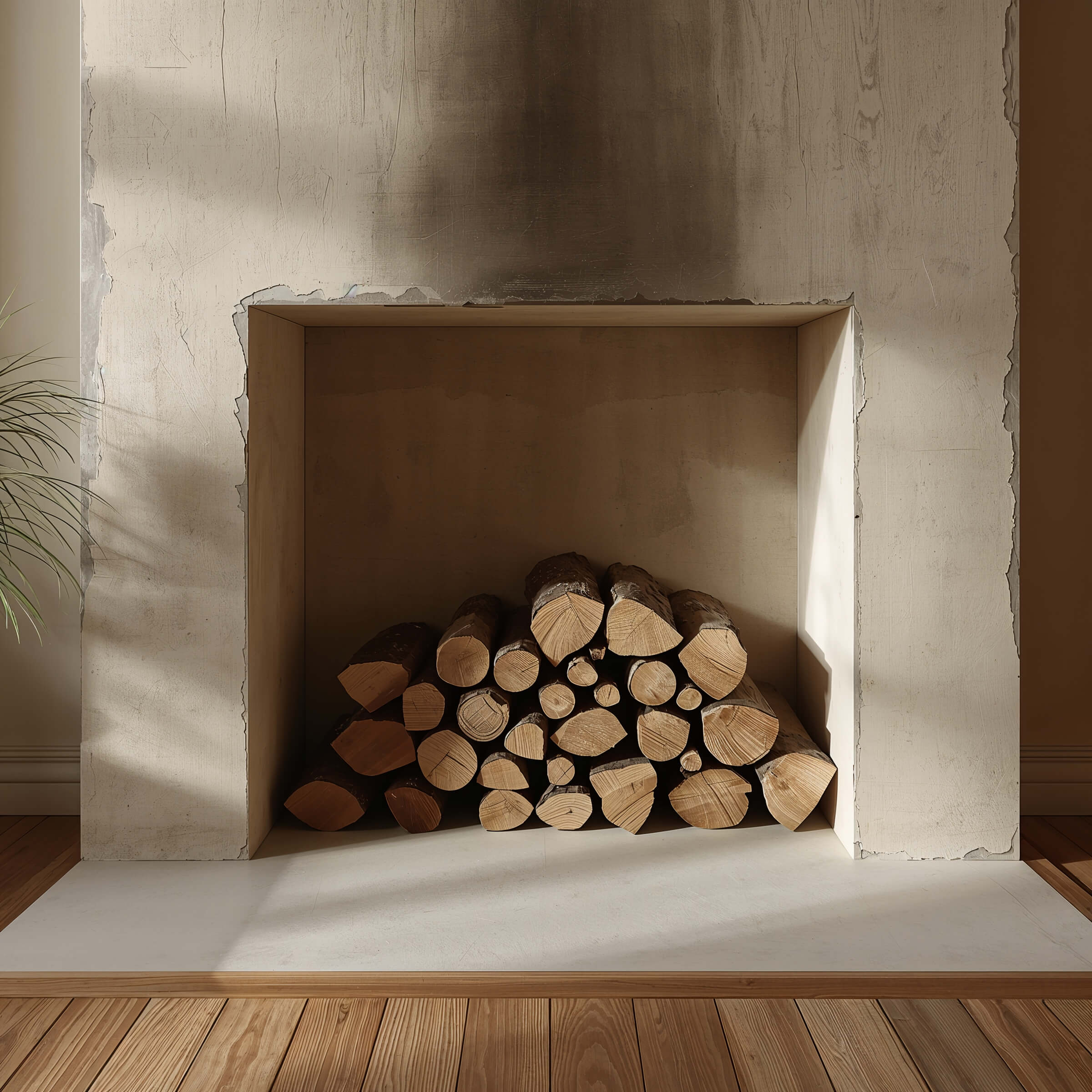 Logs fill the fireplace opening in a simple, sculptural way. They create visual interest, but they don’t clutter the space. That balance matters, especially if your room already has a lot going on.