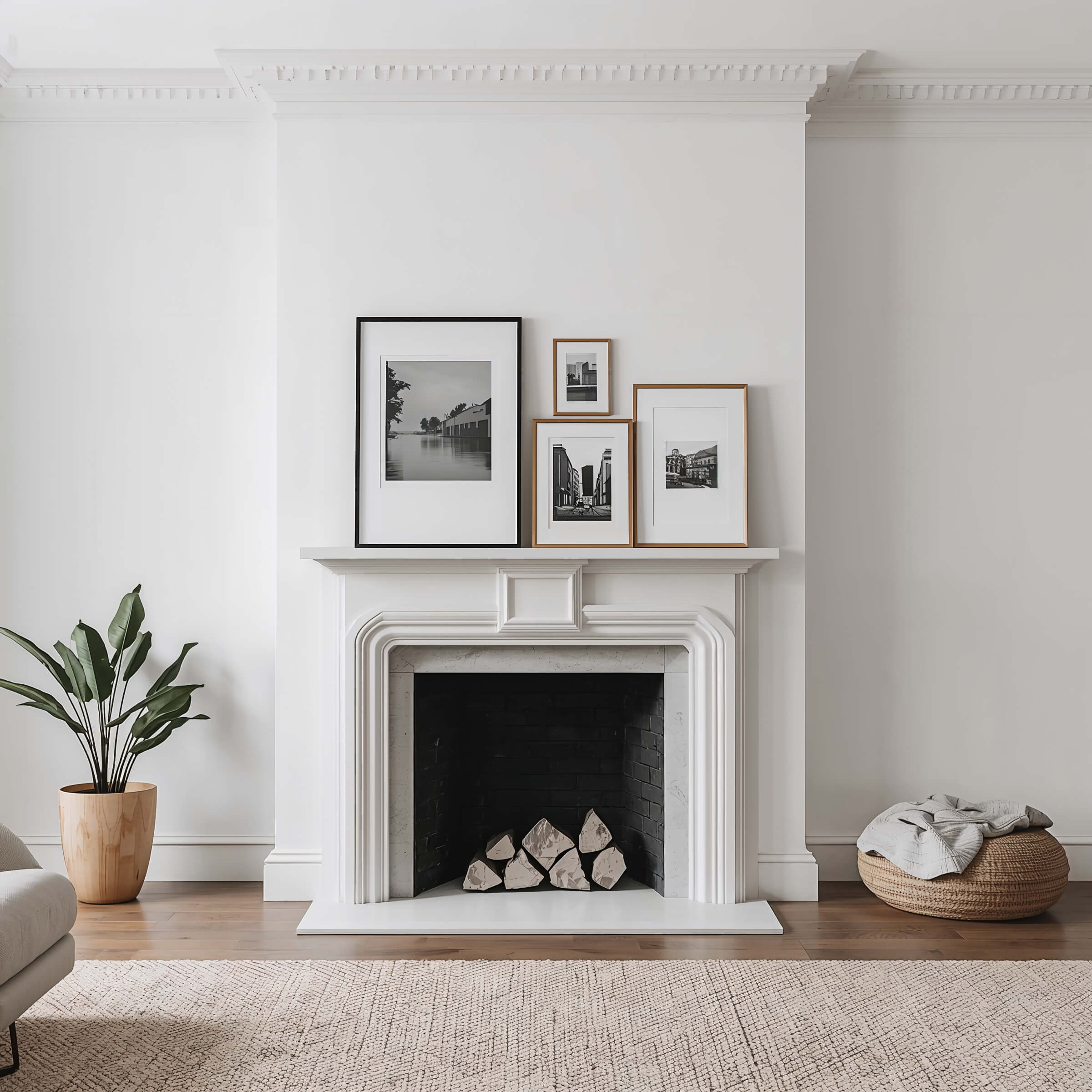 A minimalist art frame gallery inside an empty fireplace looks surprisingly chic. If you love modern or clean interiors, this idea gives the fireplace a curated, design-forward feel without adding bulk.