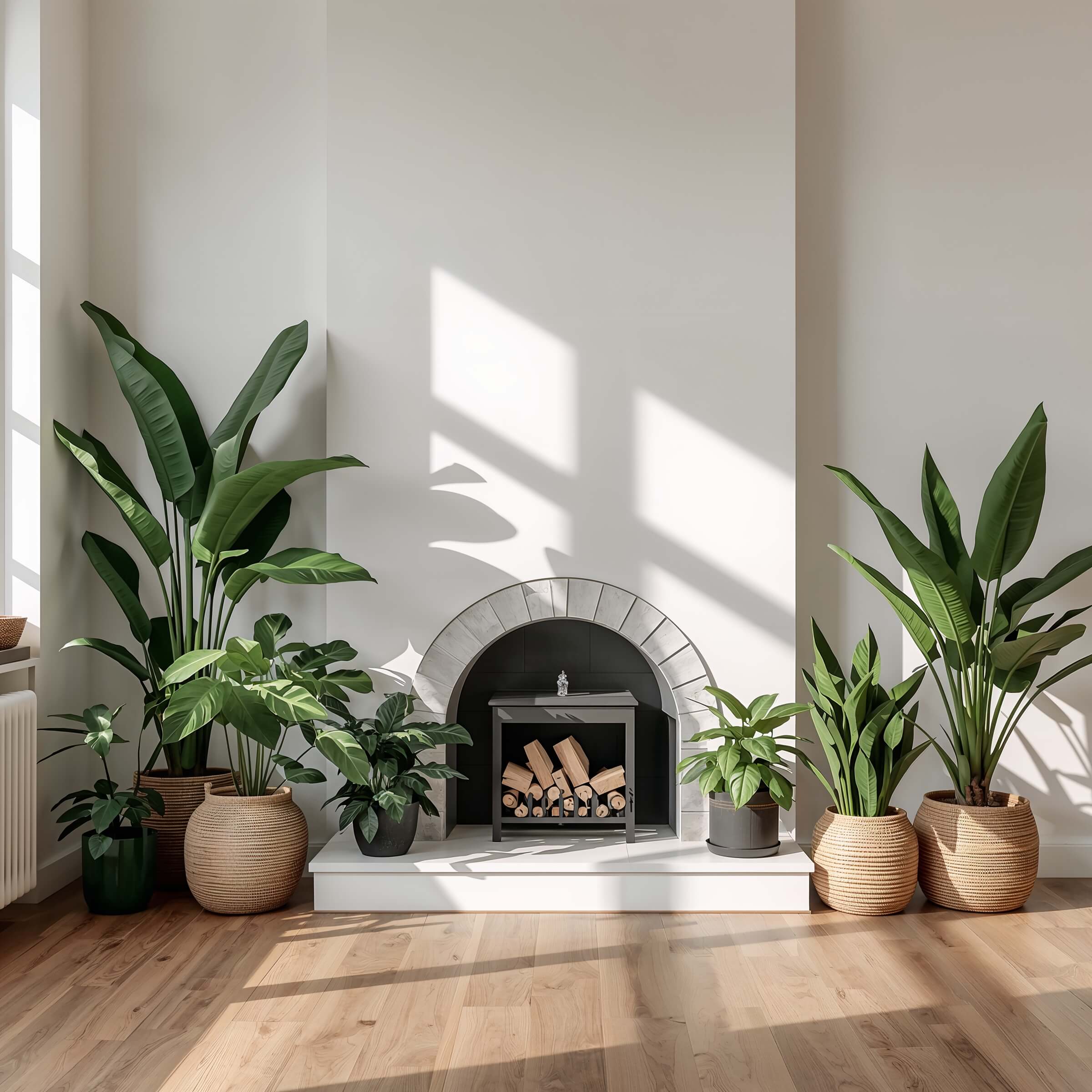 Plants bring softness and vertical movement. They also break up the heaviness of brick, stone, or dark fireplace interiors. That contrast looks amazing.