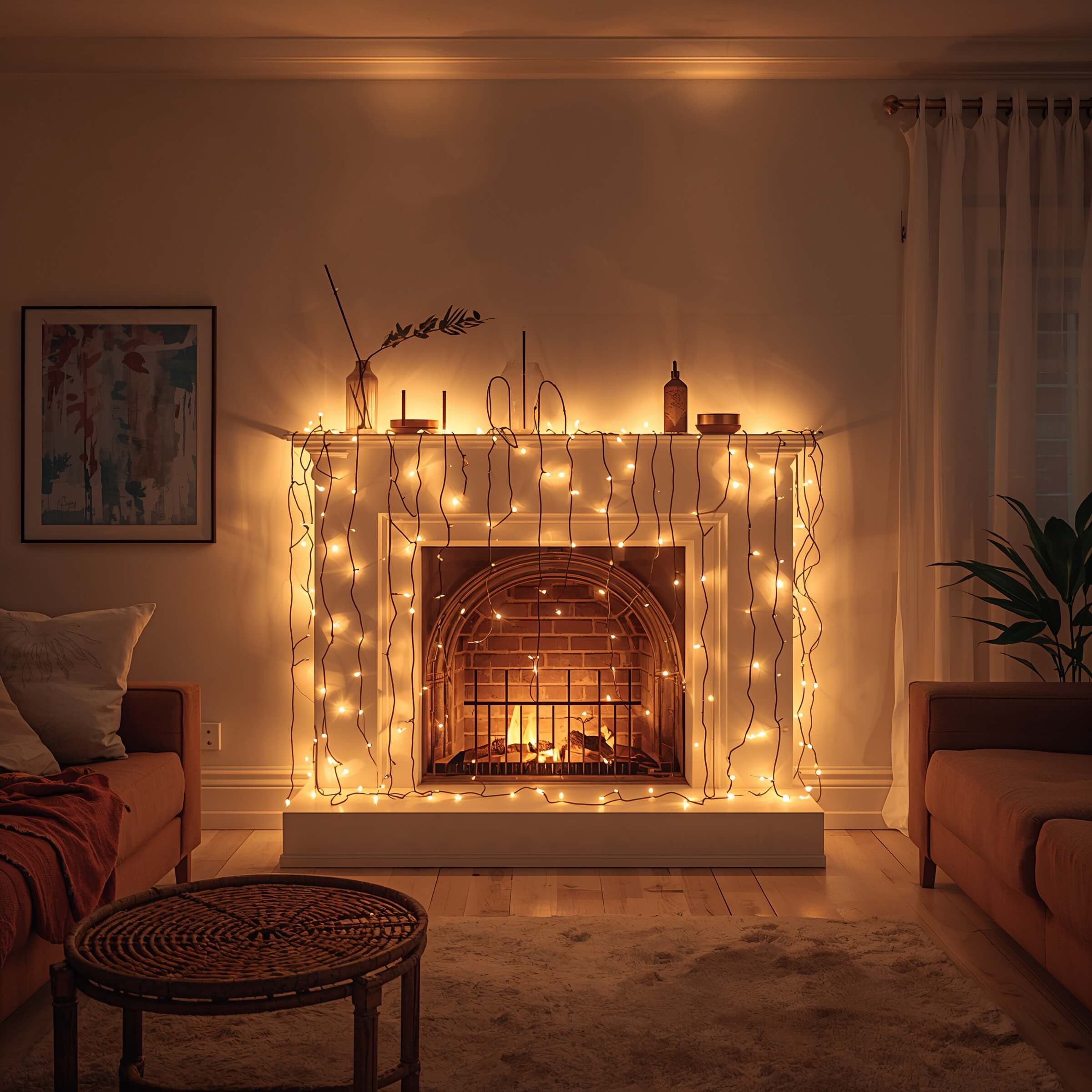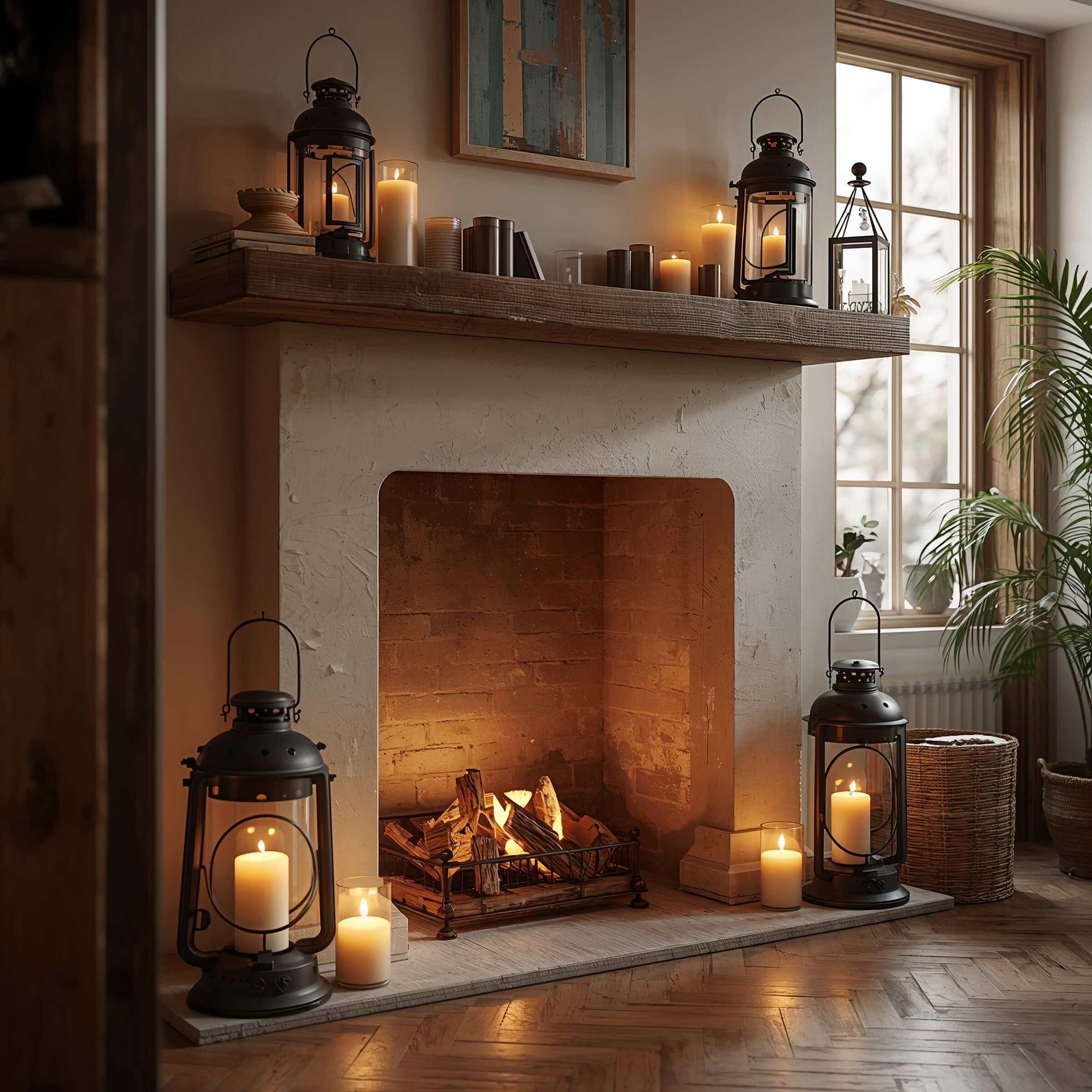 Nothing elevates a fireplace faster than soft lighting. Candles, lanterns, and fairy lights all add warmth and mood.