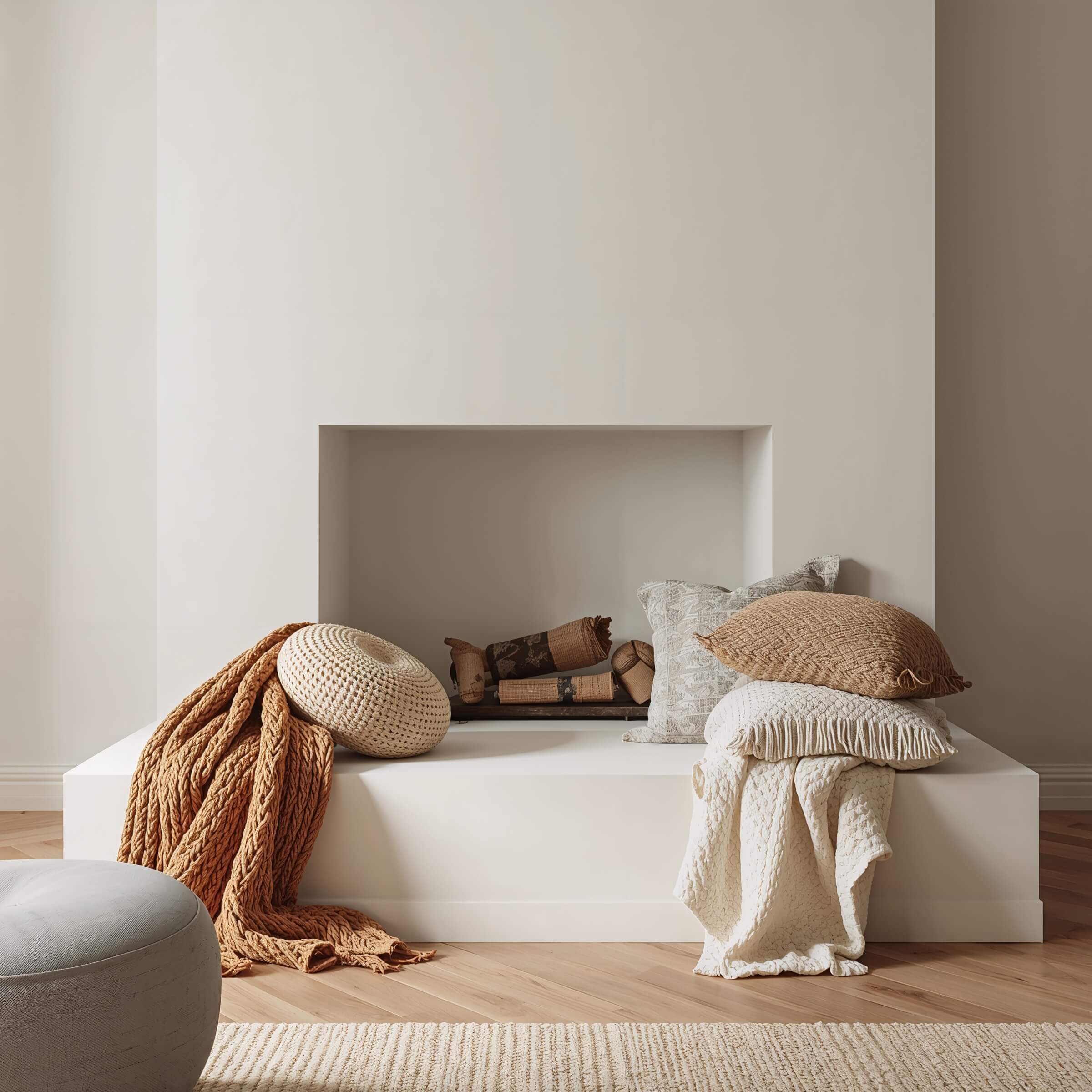 Fireplaces often have hard materials like brick, stone, or tile. Throws and pillows contrast those surfaces beautifully. That contrast creates instant coziness.