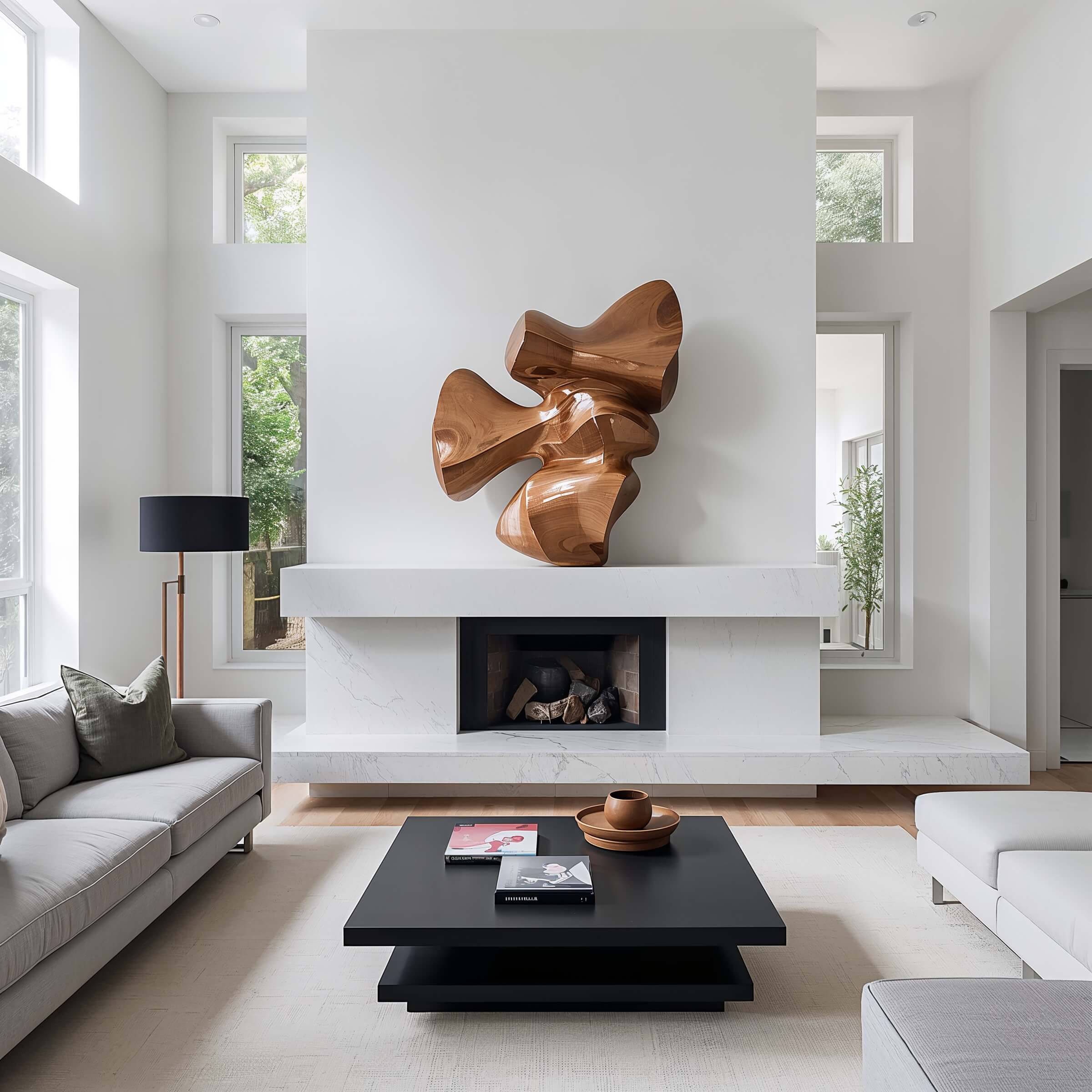 If you want your fireplace to feel bold, artistic, and a little unexpected, place a sculptural statement piece inside it. This idea treats the fireplace like a built-in display niche, and the result can look seriously impressive.