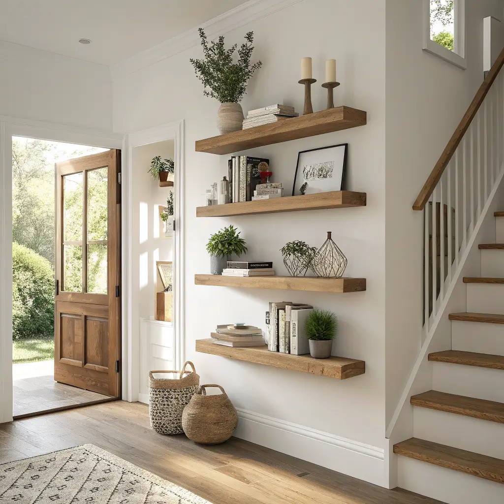 Floating shelves are one of the most versatile entrance foyer wall design ideas available because they serve double duty: they organize your space while simultaneously giving you a canvas for beautiful styling. A well-curated set of floating shelves transforms a blank wall into a dynamic display that tells guests something meaningful about who you are.