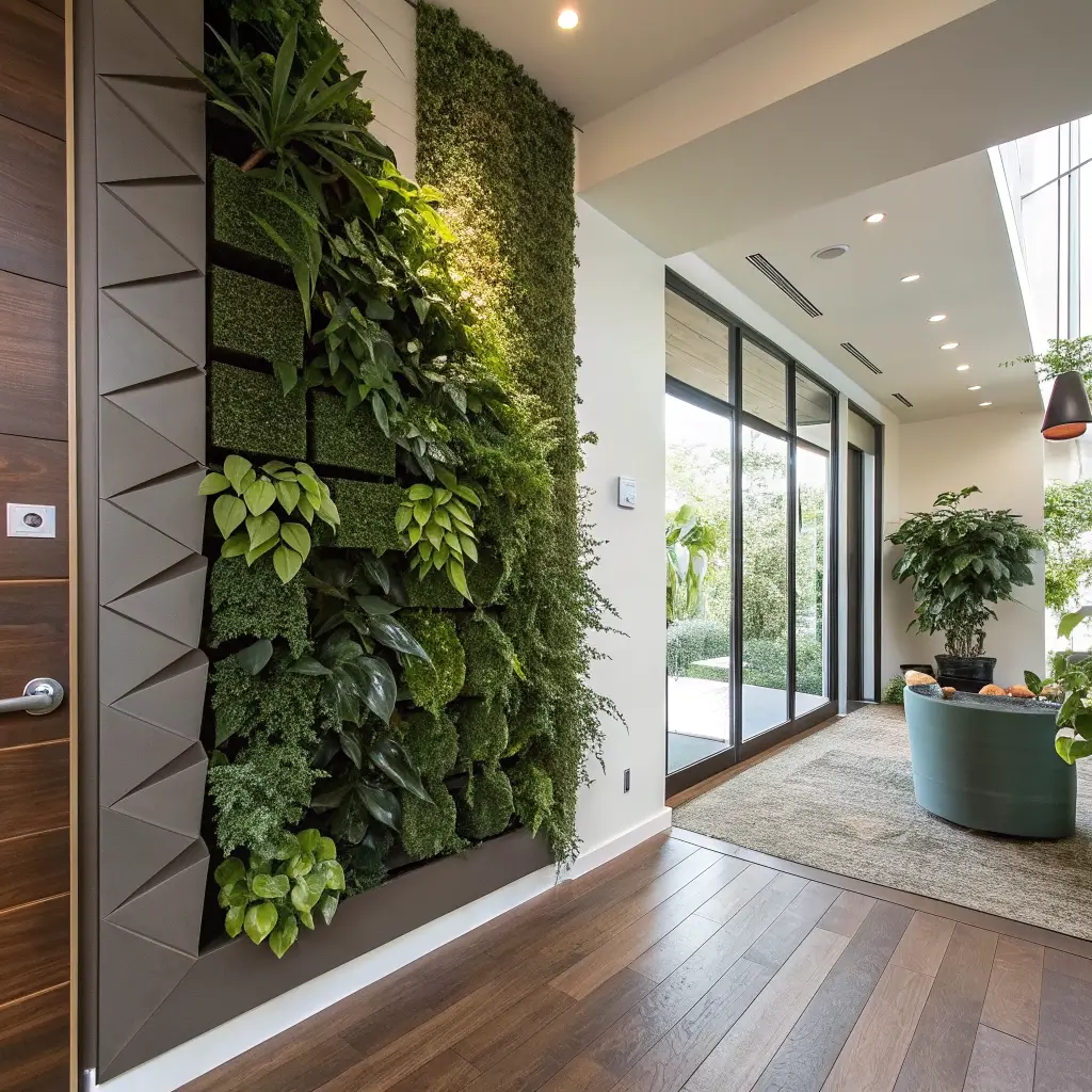 You don’t need an entire wall of plants to achieve this effect. Even a modular panel system covering a quarter of one foyer wall creates remarkable visual impact.