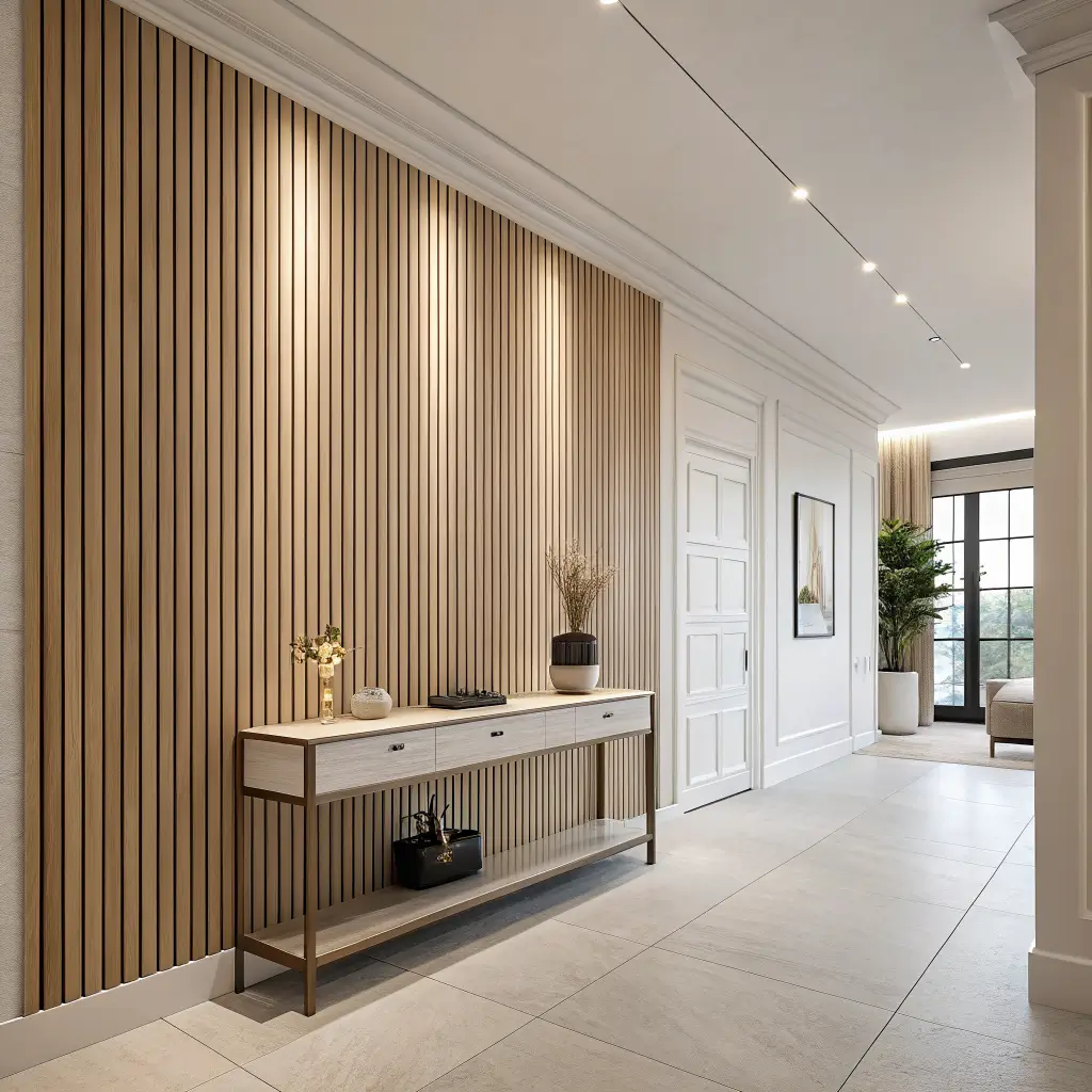 - Vertical slat panels — sleek, elongating, very contemporary; perfect for low-ceiling foyers because they draw the eye upward