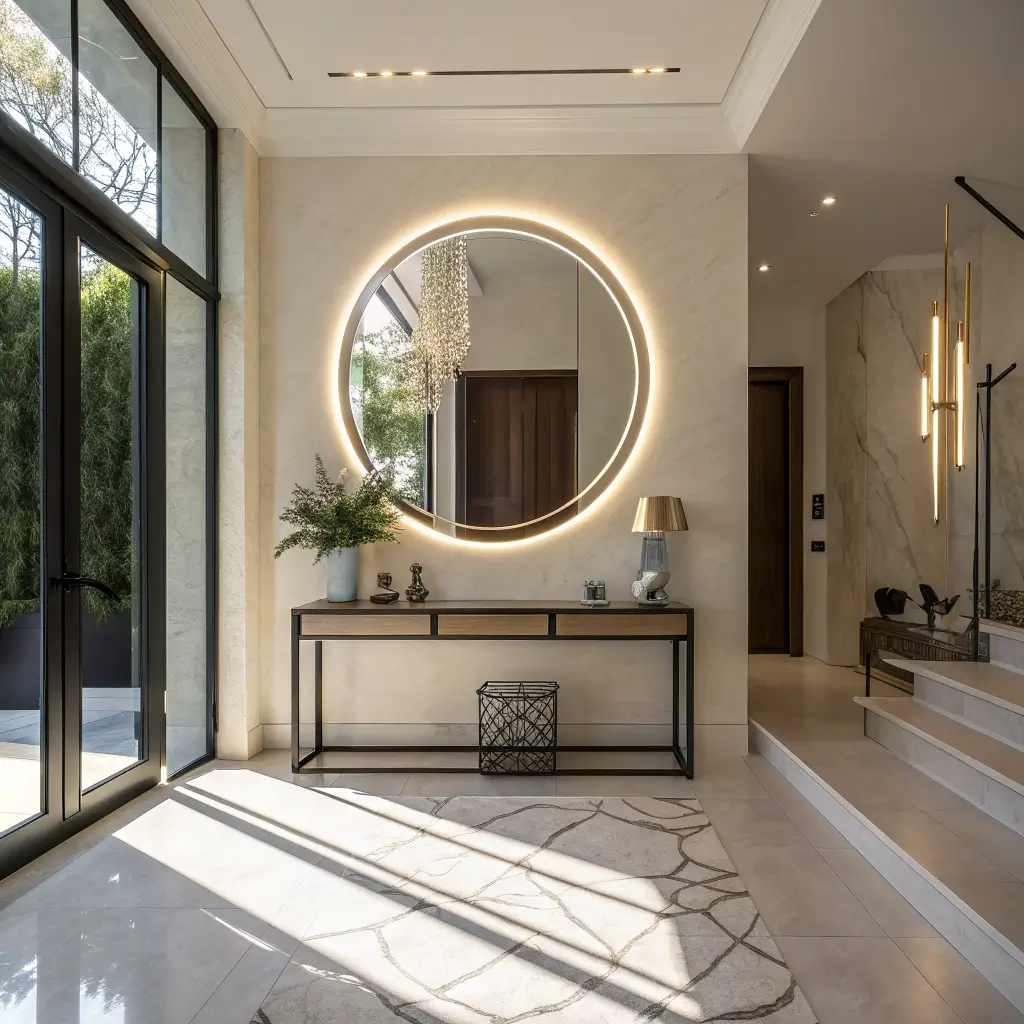 A statement mirror with LED backlighting might be the single most transformative entrance foyer wall design idea on this list. It serves three functions simultaneously: it reflects light to make the space feel larger, it adds a dramatic focal point, and the LED backlight creates an ambient glow that elevates the entire entrance atmosphere. Hotel lobby energy, residential application.