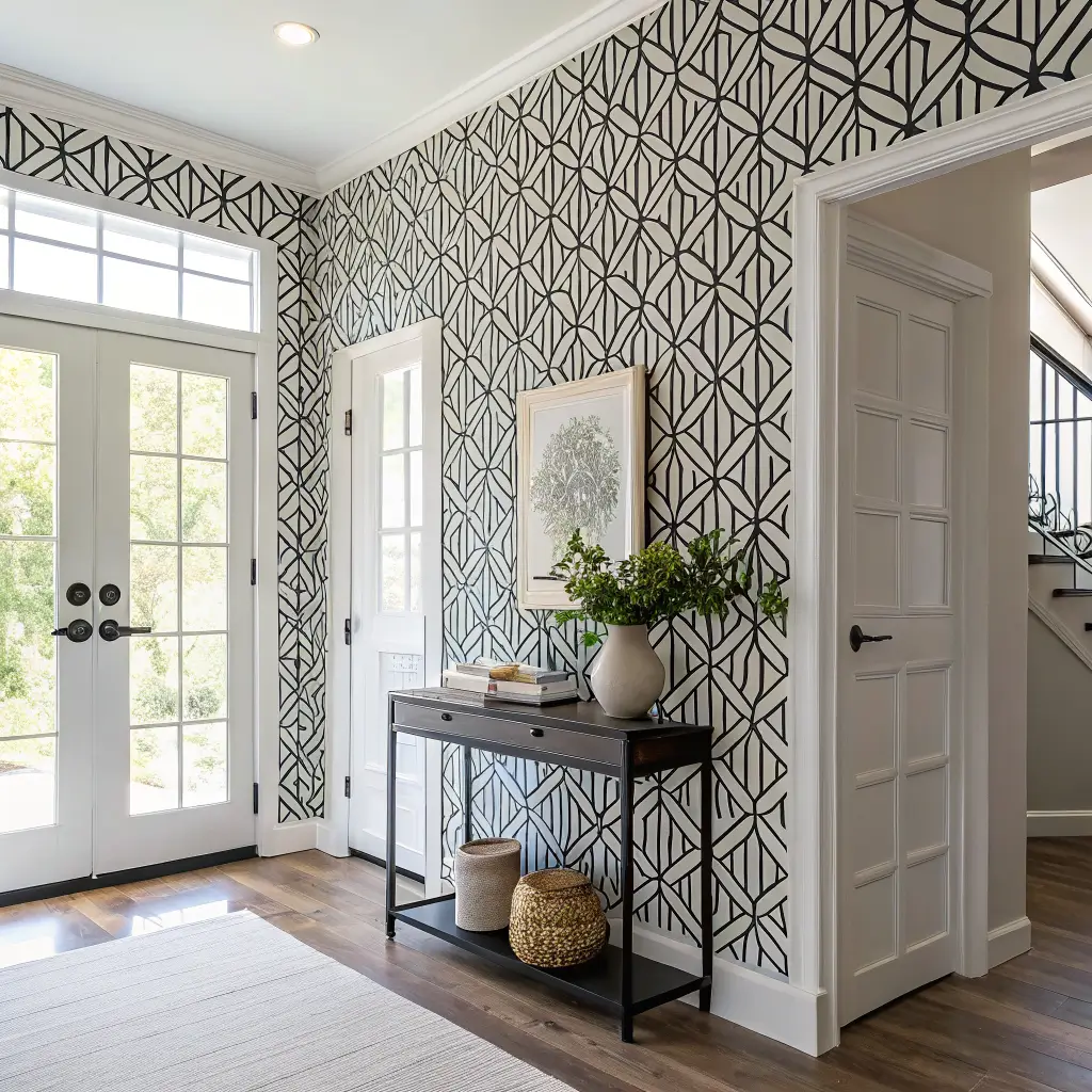 The key word in “geometric wallpaper accent” is accent. One wall. Not all four. A single wallpapered feature wall in a foyer entrance creates a focal point that anchors the space. Four wallpapered walls in a small foyer can feel claustrophobic and overwhelming.