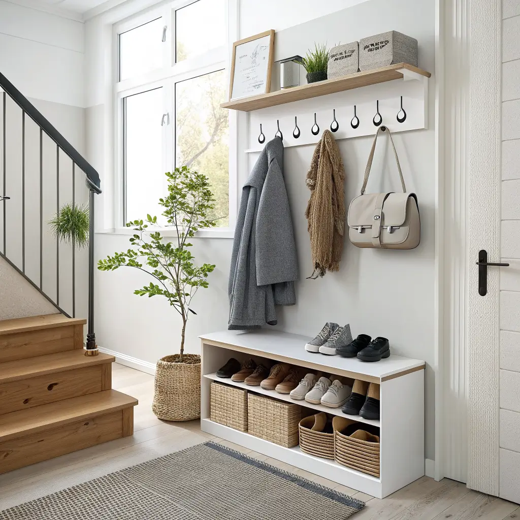 - Wall-mounted coat and shoe organizer — storage that earns its visual keep