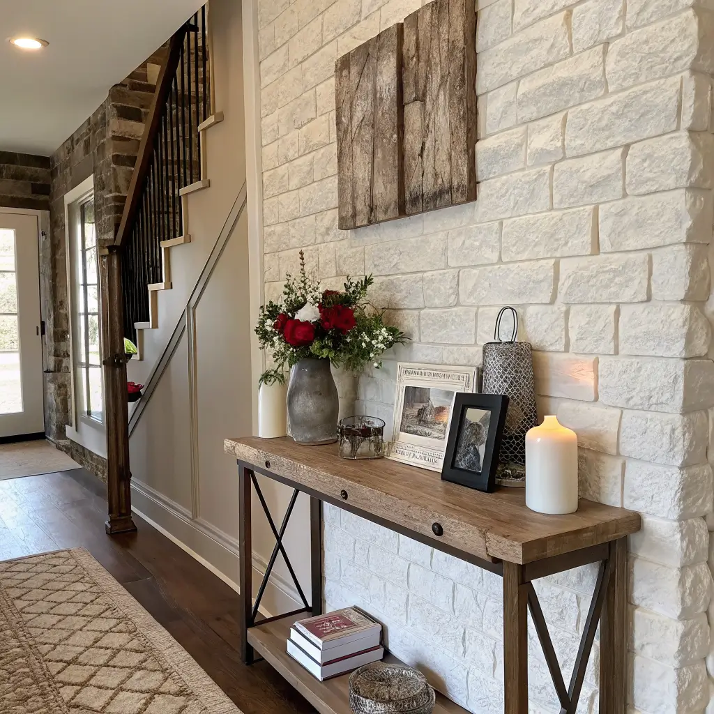 A single stone or brick accent wall at the back of a foyer entrance creates an arrival moment that genuinely stops people in their tracks. It’s one of those entrance foyer wall design ideas that photographs beautifully, but looks even better in person.