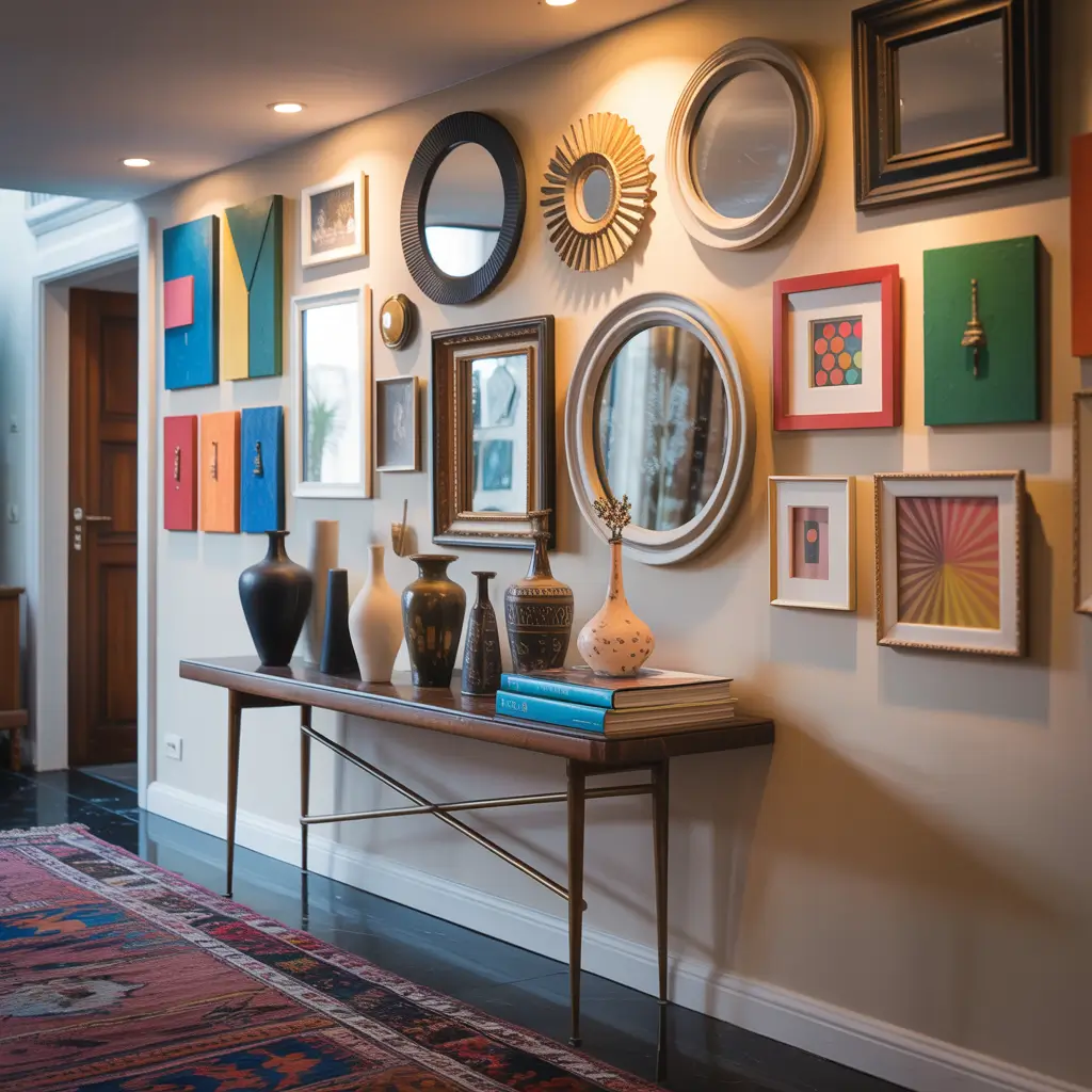 The key to making this work? Vary the heights and sizes dramatically. Put a tiny mirror next to a large canvas, add a medium-sized piece above. The unexpected proportions create energy that static, uniform arrangements just can’t match.