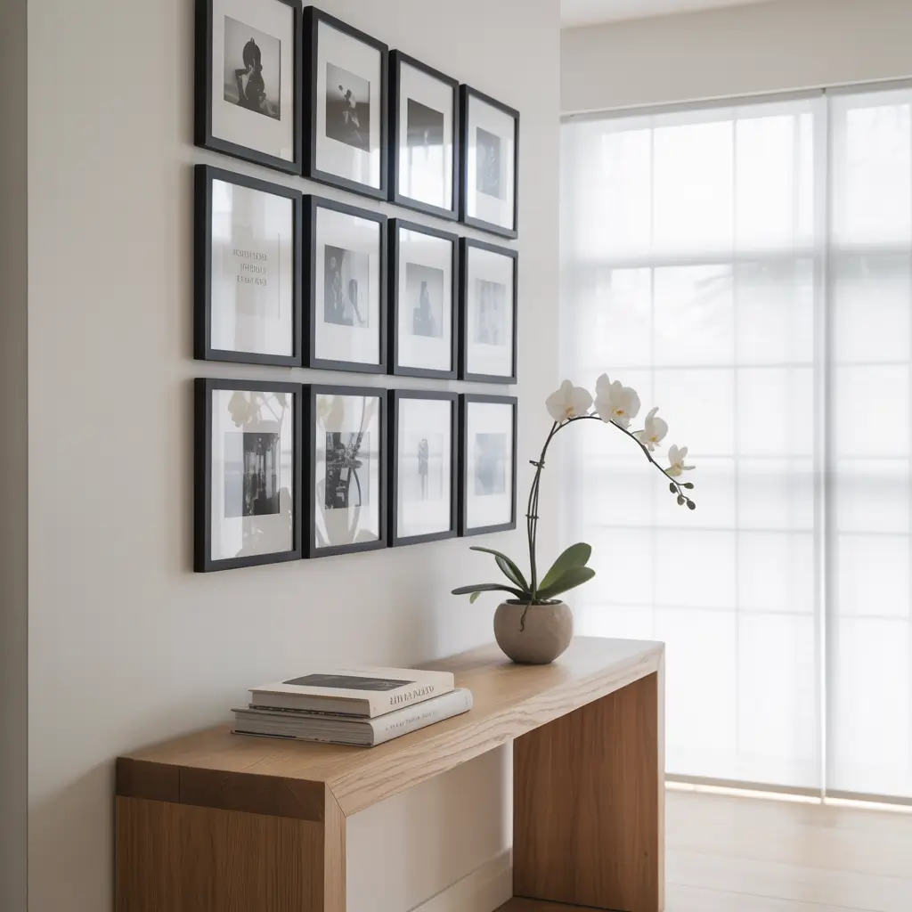 I created a 3×3 grid of black and white family photos, all printed the same size and framed identically. The uniformity creates calm in my otherwise chaotic entryway. The monochrome palette means nothing clashes, no matter what seasonal decor I add.