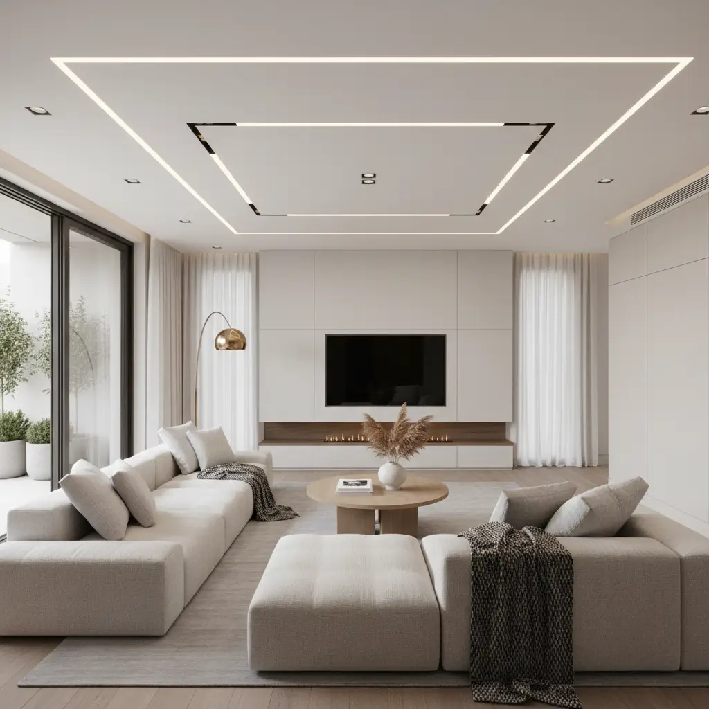 Start with a simple peripheral false ceiling if you’re nervous about commitment. This design drops down around the edges while keeping the center at original height. I did this in my bedroom, and it created the perfect spot for hidden LED strips while making the room feel taller.
