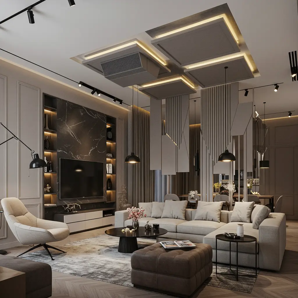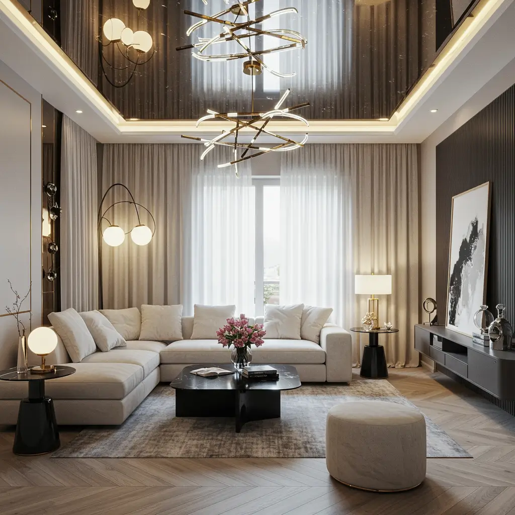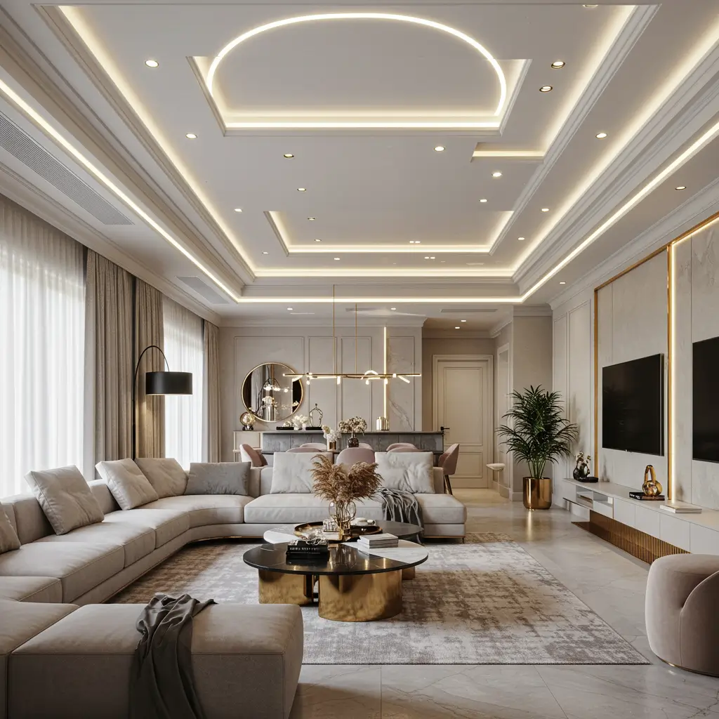 Strategic mirror accents in false ceilings create the illusion of infinite height. I added mirror strips between gypsum panels in my small hallway, and suddenly the cramped corridor feels like a gallery.