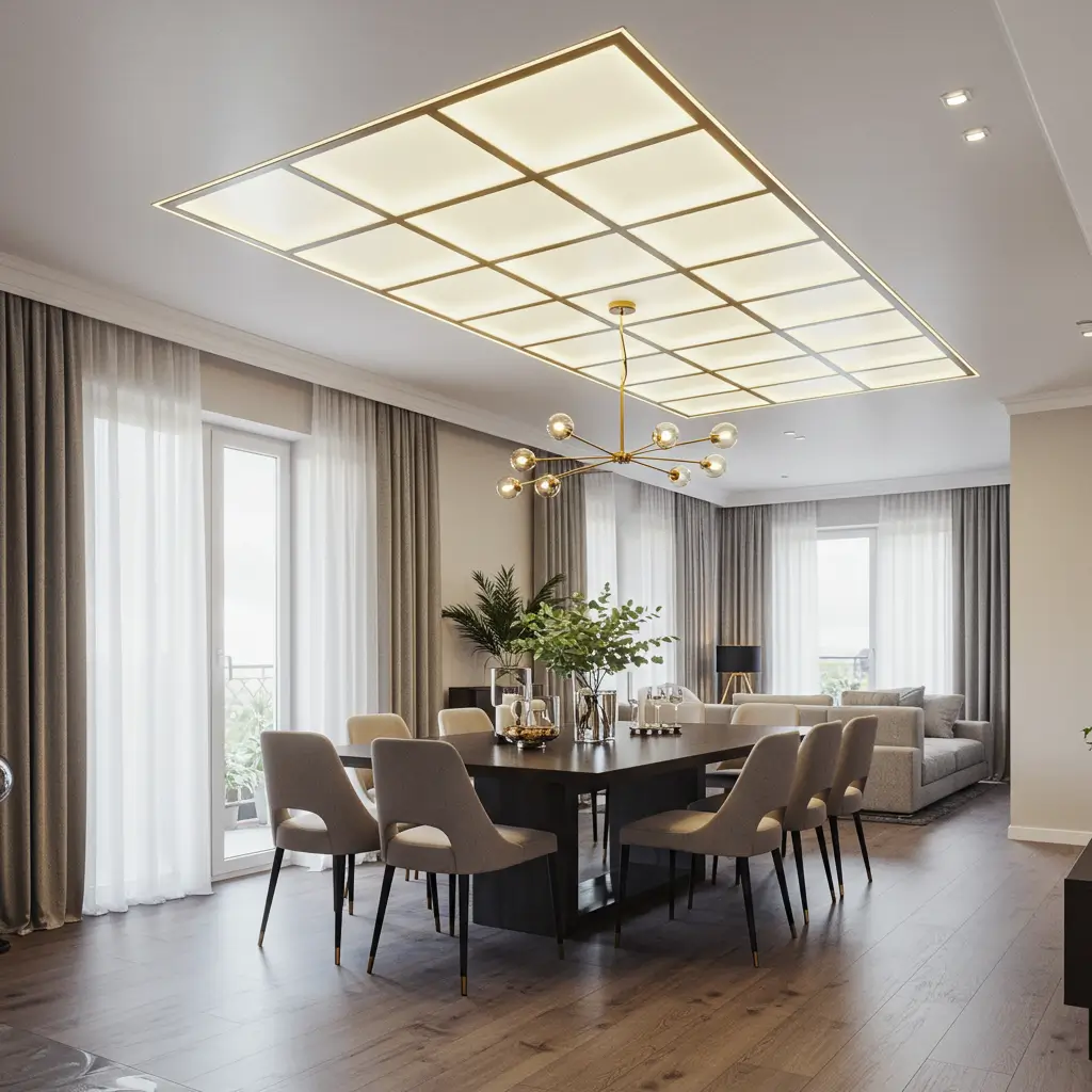 Glass inserts in false ceilings create luminous panels that feel both modern and timeless. I installed frosted glass panels with LED backlighting in my kitchen, and the result looks like something from a high-end restaurant.