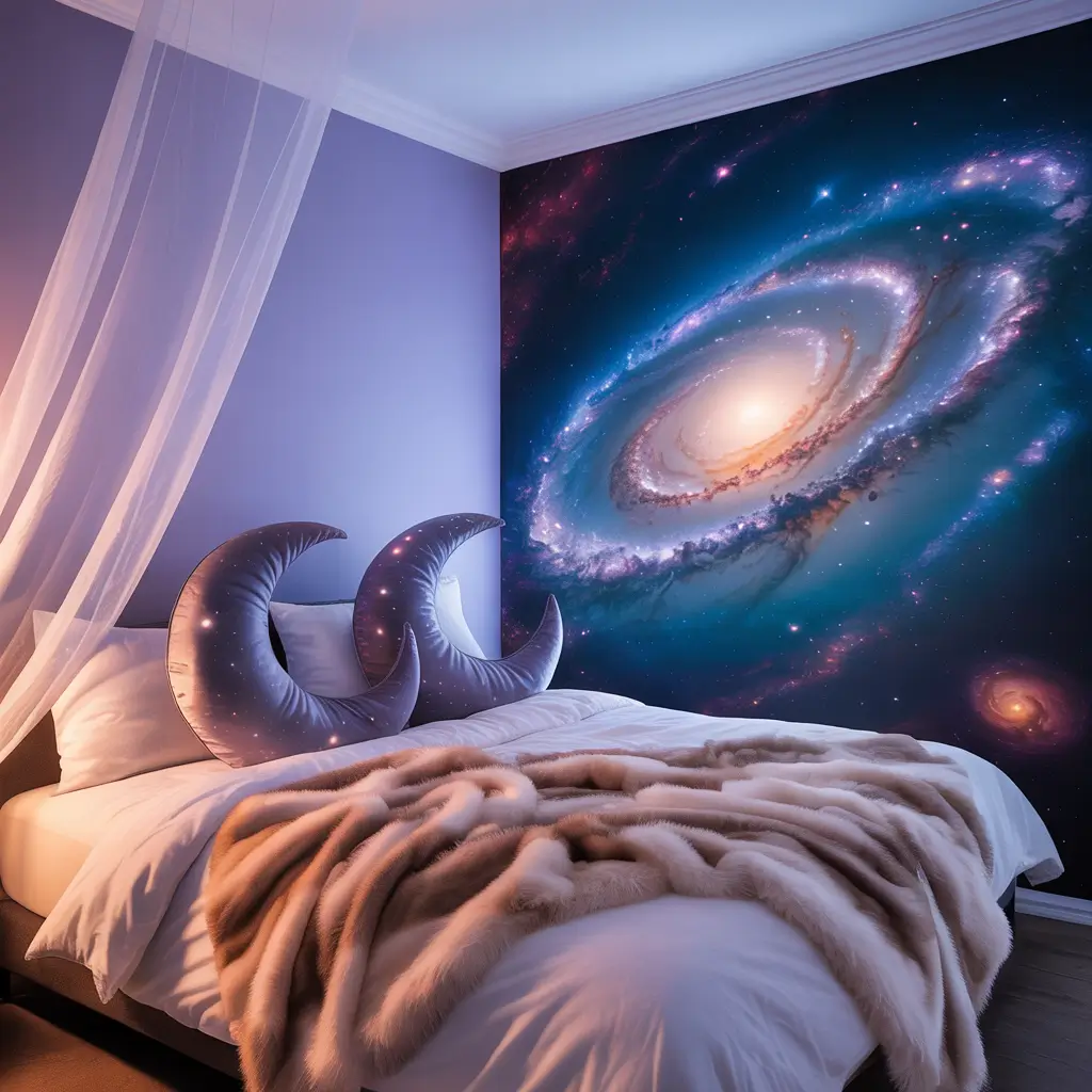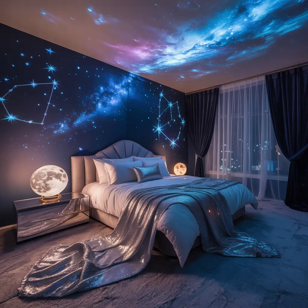 Build your palette around midnight blues, deep purples, and black with silver and gold star accents. The room should feel like stepping out under a starry sky, complete with that sense of infinite possibility.