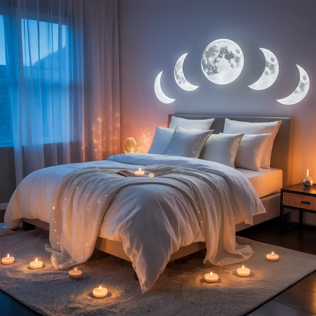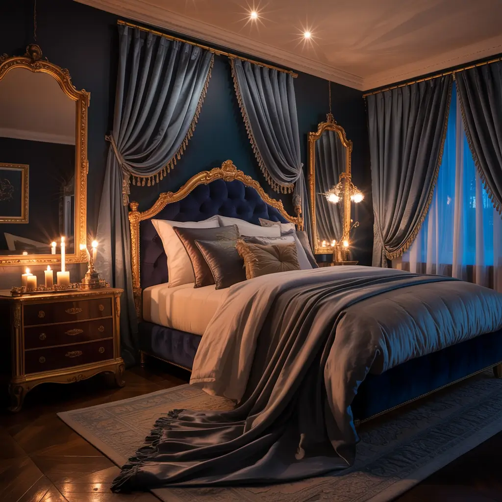 The midnight enchantment suite creates a bedroom that comes alive after dark. This aesthetic embraces the mystery and magic of nighttime with deep colors, twinkling lights, and moonlit vibes. Perfect for night owls who feel most creative after midnight.