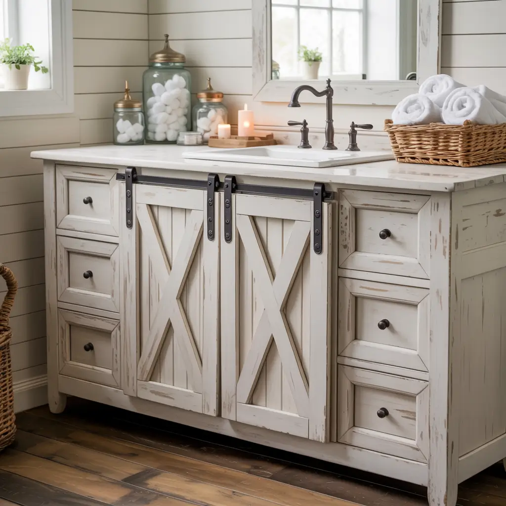 Can we talk about how sliding barn doors solve every awkward bathroom layout ever? I installed a vanity with mini barn doors in my powder room, and those sliders saved me from doing door-swing gymnastics in a 5×7 space.